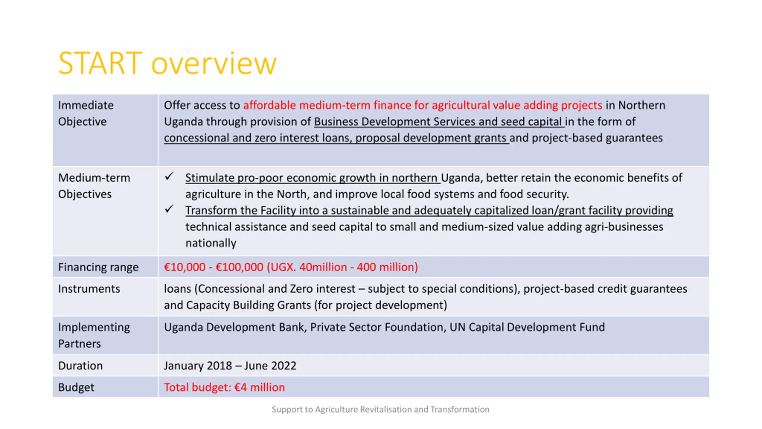 START overview Immediate Objective Offer access to affordable medium-term finance for agricultural value adding projects in Northern Uganda through provision of Business Development Services and seed capital in the form of concessional and zero interest loans, proposal development grants and project-based guarantees Medium-term Objectives Stimulate pro-poor economic growth in northern Uganda, better retain the economic benefits of agriculture in the North, and improve local food systems and food security. Transform the Facility into a sustainable and adequately capitalized loan/grant facility providing technical assistance and seed capital to small and medium-sized value adding agri-businesses nationally Financing range 10,000 - 100,000 (UGX. 40million - 400 million) Instruments loans (Concessional and Zero interest subject to special conditions), project-based credit guarantees and Capacity Building Grants (for project development) Implementing Partners Uganda Development Bank, Private Sector Foundation, UN Capital Development Fund Duration January 2018 June 2022 Budget Total budget: 4 million Support to Agriculture Revitalisation and Transformation
