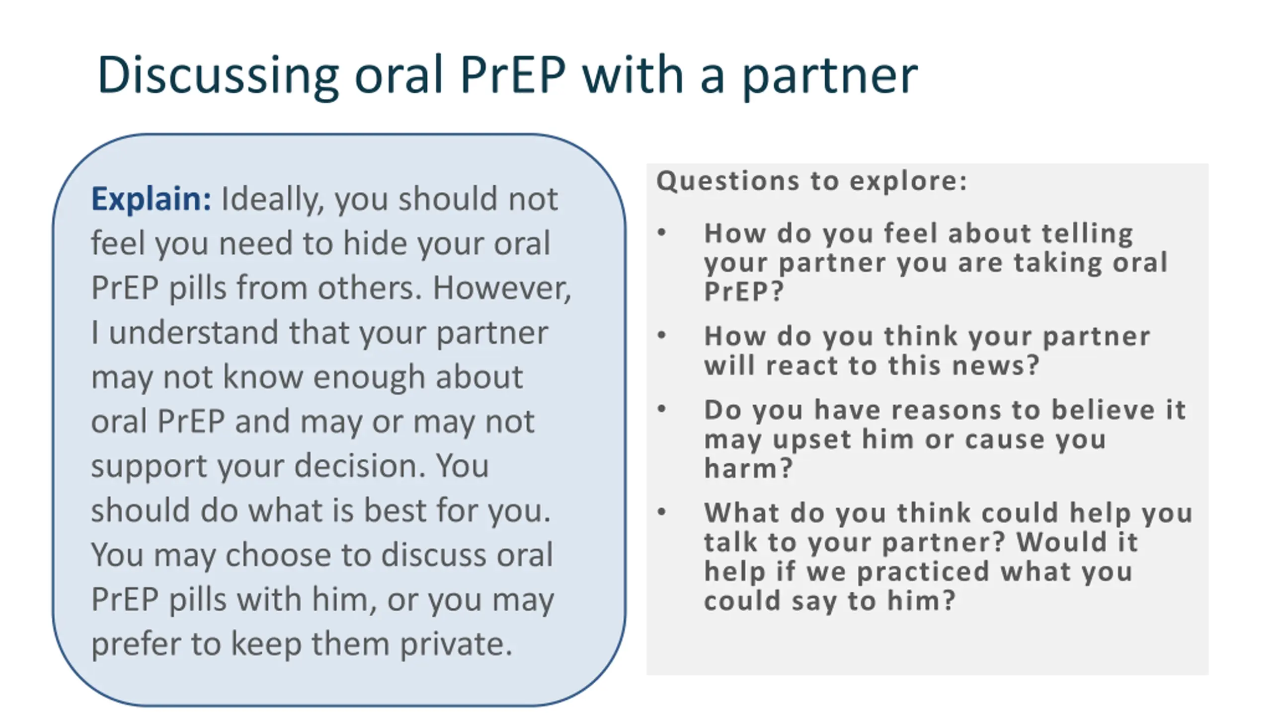Discussing oral PrEP with a partner Questions to explore: Explain: Ideally, you should not feel you need to hide your oral PrEP pills from others. However, I understand that your partner may not know enough about oral PrEP and may or may not support your decision. You should do what is best for you. You may choose to discuss oral PrEP pills with him, or you may prefer to keep them private. How do you feel about telling your partner you are taking oral PrEP? How do you think your partner will react to this news? Do you have reasons to believe it may upset him or cause you harm? What do you think could help you talk to your partner? Would it help if we practiced what you could say to him?