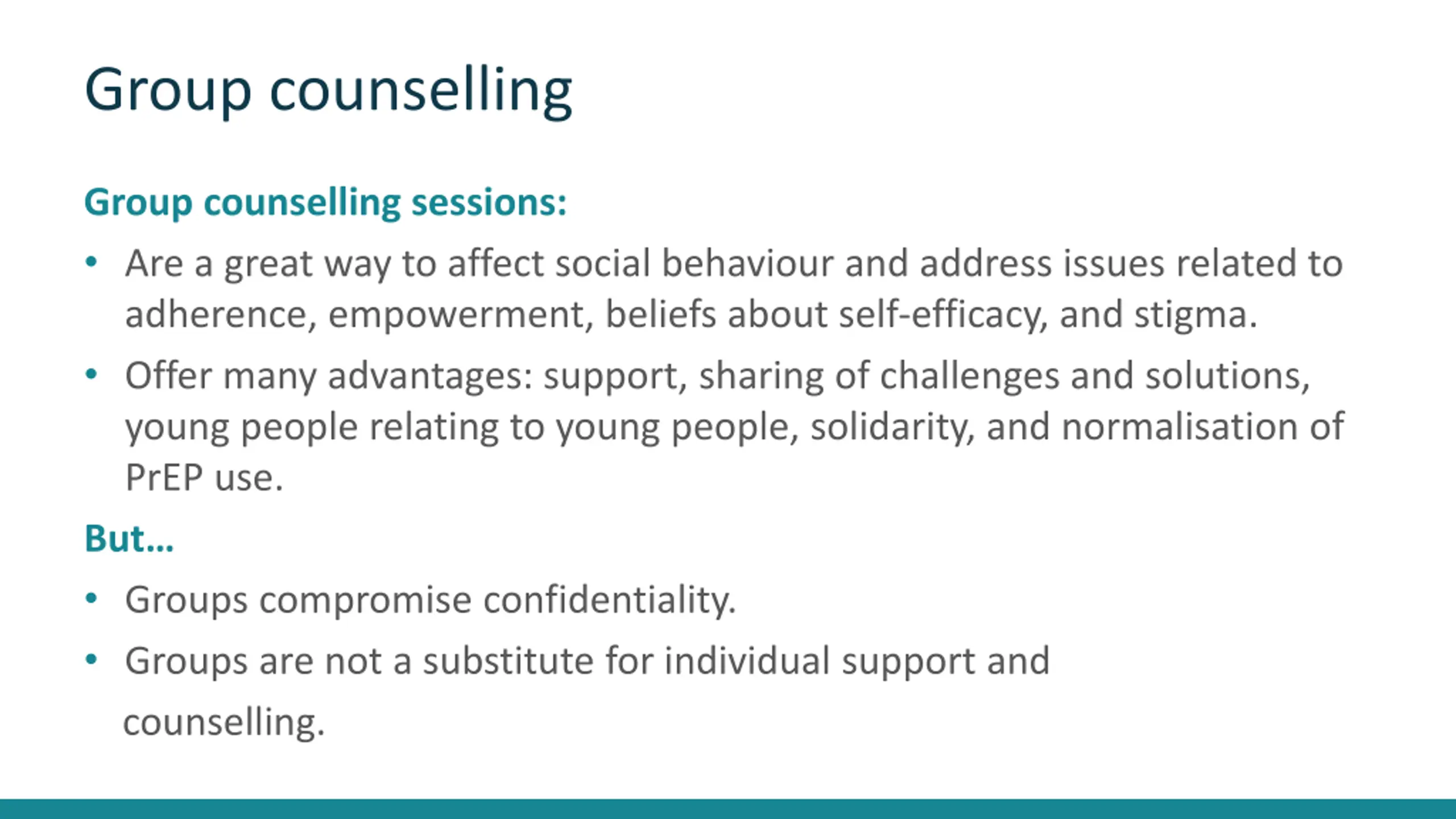 Group counselling Group counselling sessions: Are a great way to affect social behaviour and address issues related to adherence, empowerment, beliefs about self-efficacy, and stigma. Offer many advantages: support, sharing of challenges and solutions, young people relating to young people, solidarity, and normalisation of PrEP use. But Groups compromise confidentiality. Groups are not a substitute for individual support and counselling. 13
