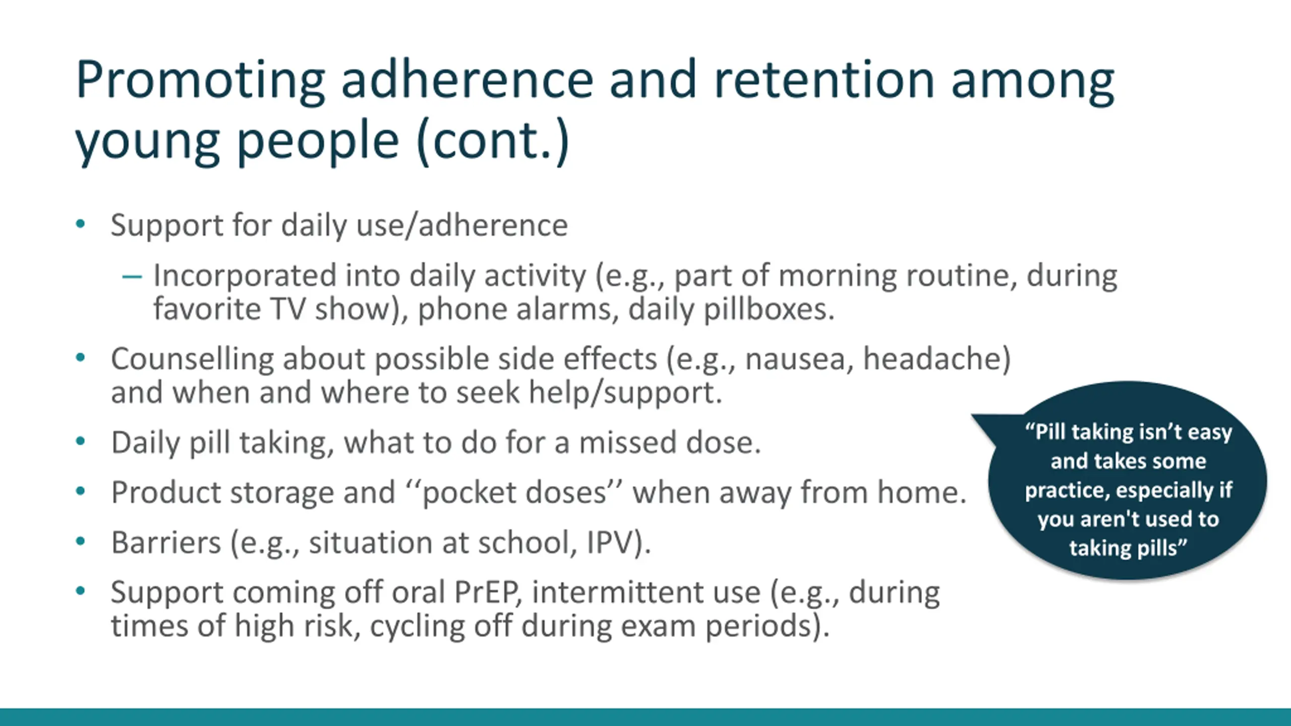 Promoting adherence and retention among young people (cont.) Support for daily use/adherence Incorporated into daily activity (e.g., part of morning routine, during favorite TV show), phone alarms, daily pillboxes. Counselling about possible side effects (e.g., nausea, headache) and when and where to seek help/support. Daily pill taking, what to do for a missed dose. Product storage and pocket doses when away from home. Barriers (e.g., situation at school, IPV). Support coming off oral PrEP, intermittent use (e.g., during times of high risk, cycling off during exam periods). Pill taking isn t easy and takes some practice, especially if you aren't used to taking pills 8