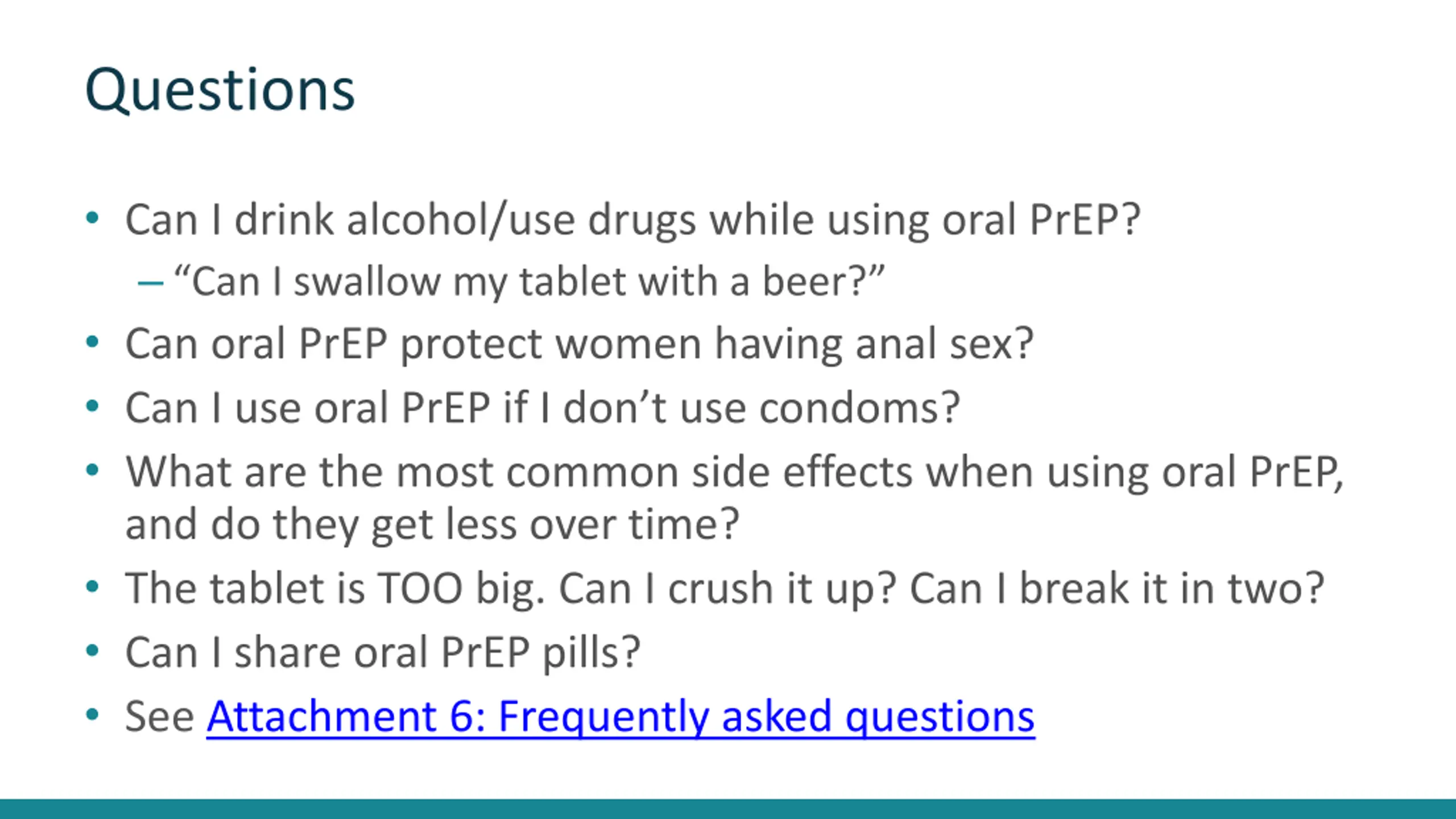 Questions Can I drink alcohol/use drugs while using oral PrEP? Can I swallow my tablet with a beer? Can oral PrEP protect women having anal sex? Can I use oral PrEP if I don t use condoms? What are the most common side effects when using oral PrEP, and do they get less over time? The tablet is TOO big. Can I crush it up? Can I break it in two? Can I share oral PrEP pills? See Attachment 6: Frequently asked questions 18
