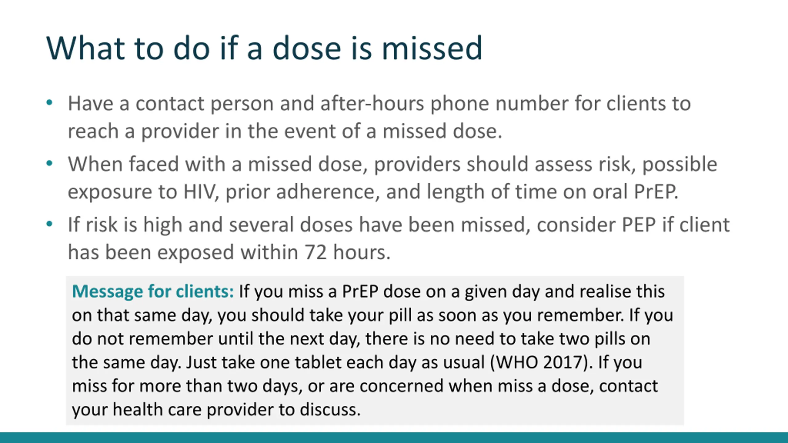 What to do if a dose is missed Have a contact person and after-hours phone number for clients to reach a provider in the event of a missed dose. When faced with a missed dose, providers should assess risk, possible exposure to HIV, prior adherence, and length of time on oral PrEP. If risk is high and several doses have been missed, consider PEP if client has been exposed within 72 hours. Message for clients: If you miss a PrEP dose on a given day and realise this on that same day, you should take your pill as soon as you remember. If you do not remember until the next day, there is no need to take two pills on the same day. Just take one tablet each day as usual (WHO 2017). If you miss for more than two days, or are concerned when miss a dose, contact your health care provider to discuss. 10