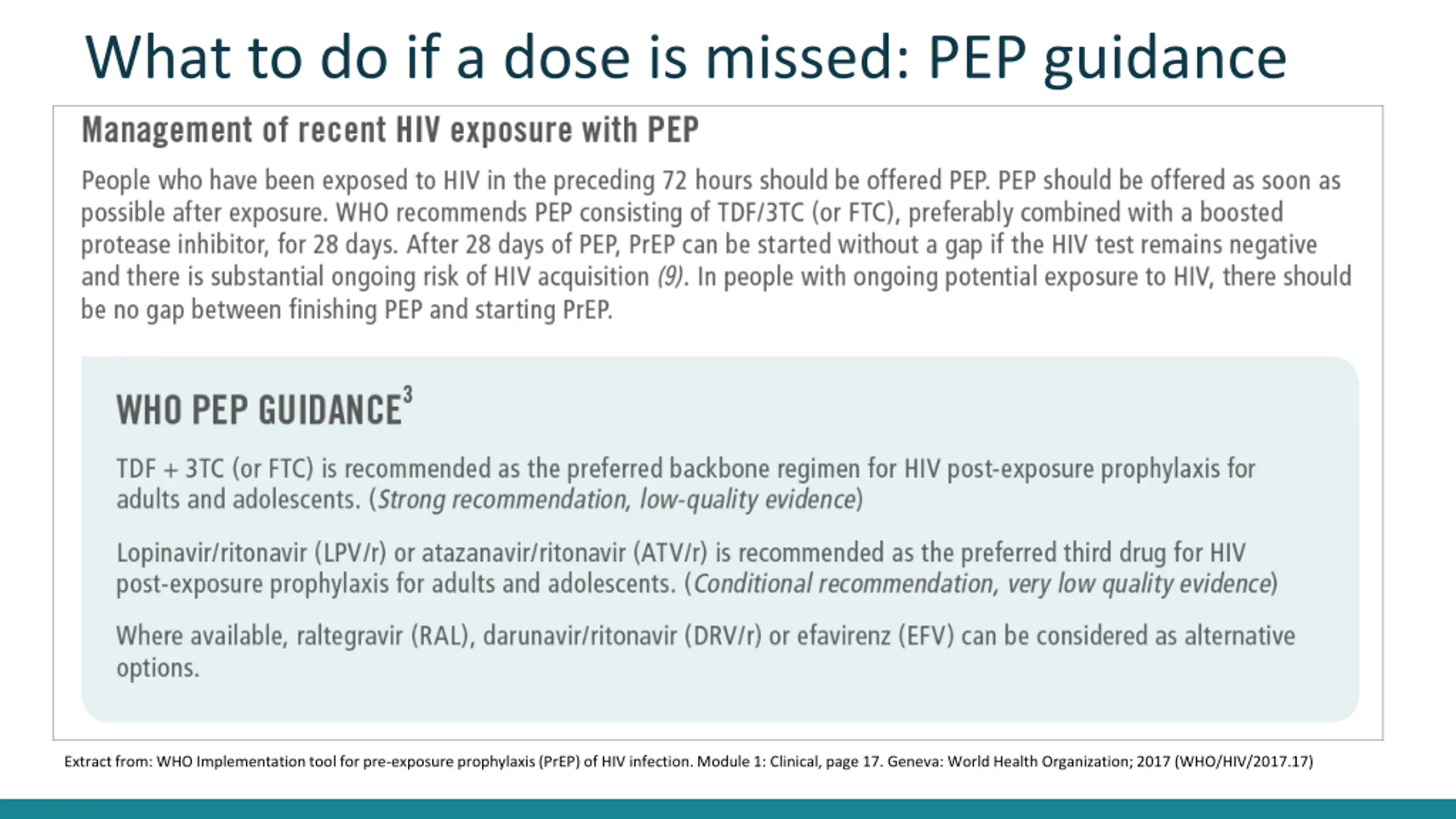What to do if a dose is missed: PEP guidance Extract from: WHO Implementation tool for pre-exposure prophylaxis (PrEP) of HIV infection. Module 1: Clinical, page 17. Geneva: World Health Organization; 2017 (WHO/HIV/2017.17) 11