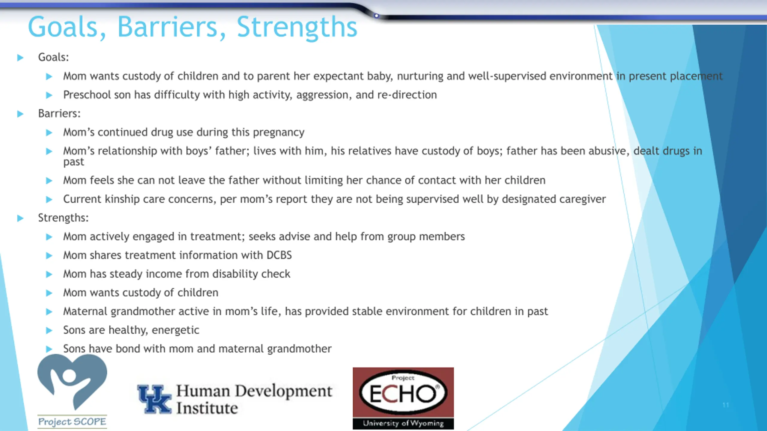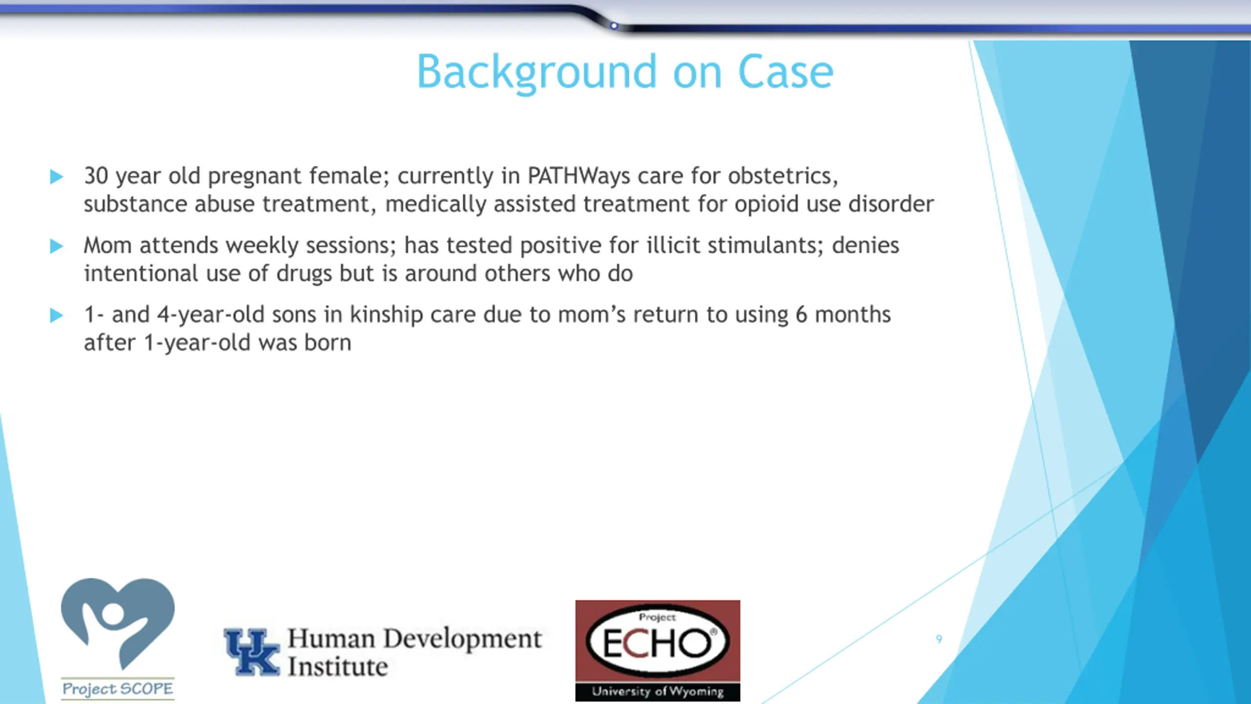 Background on Case 30 year old pregnant female; currently in PATHWays care for obstetrics, substance abuse treatment, medically assisted treatment for opioid use disorder Mom attends weekly sessions; has tested positive for illicit stimulants; denies intentional use of drugs but is around others who do 1- and 4-year-old sons in kinship care due to mom s return to using 6 months after 1-year-old was born 9