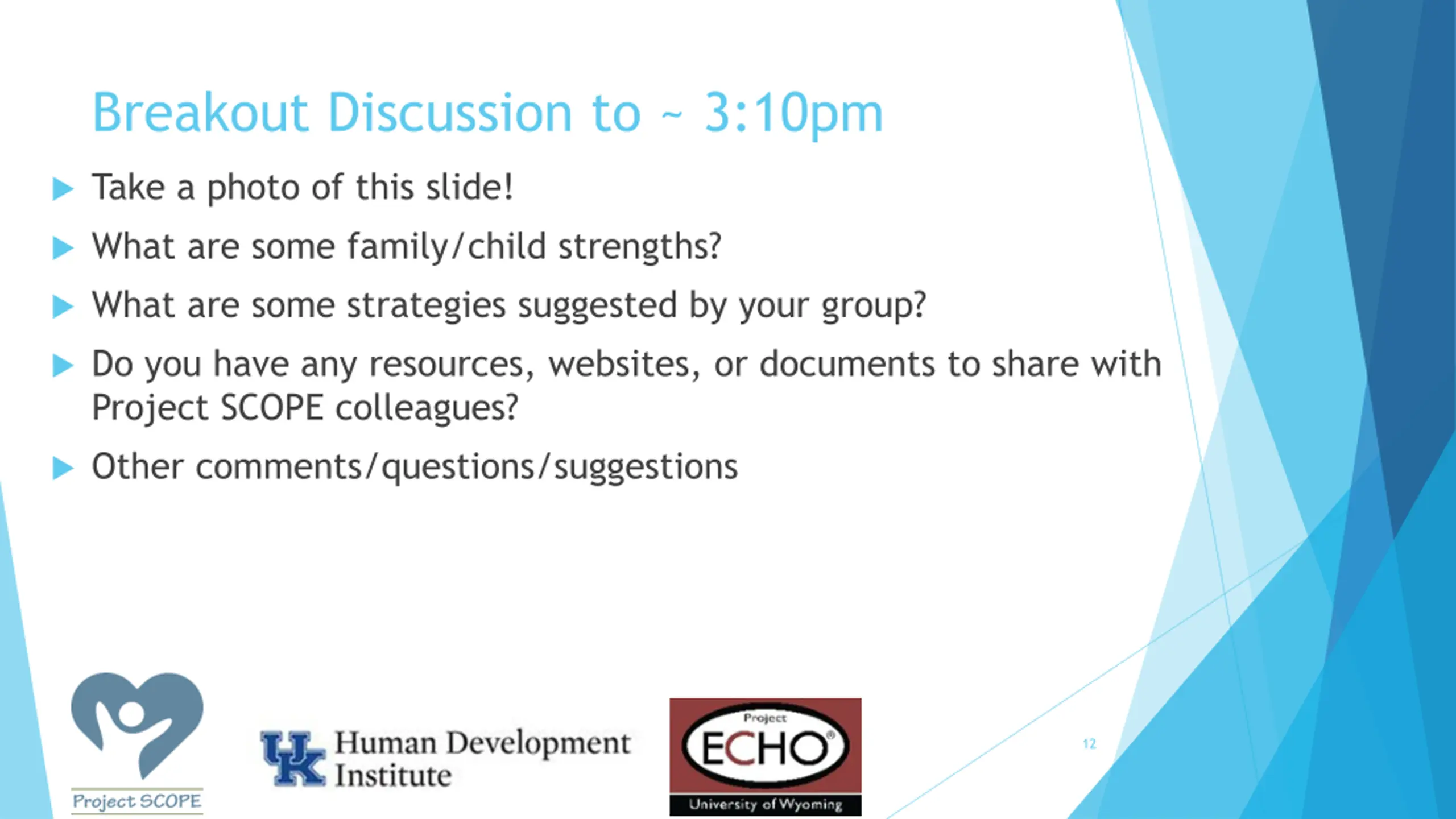 Breakout Discussion to ~ 3:10pm Take a photo of this slide! What are some family/child strengths? What are some strategies suggested by your group? Do you have any resources, websites, or documents to share with Project SCOPE colleagues? Other comments/questions/suggestions 12