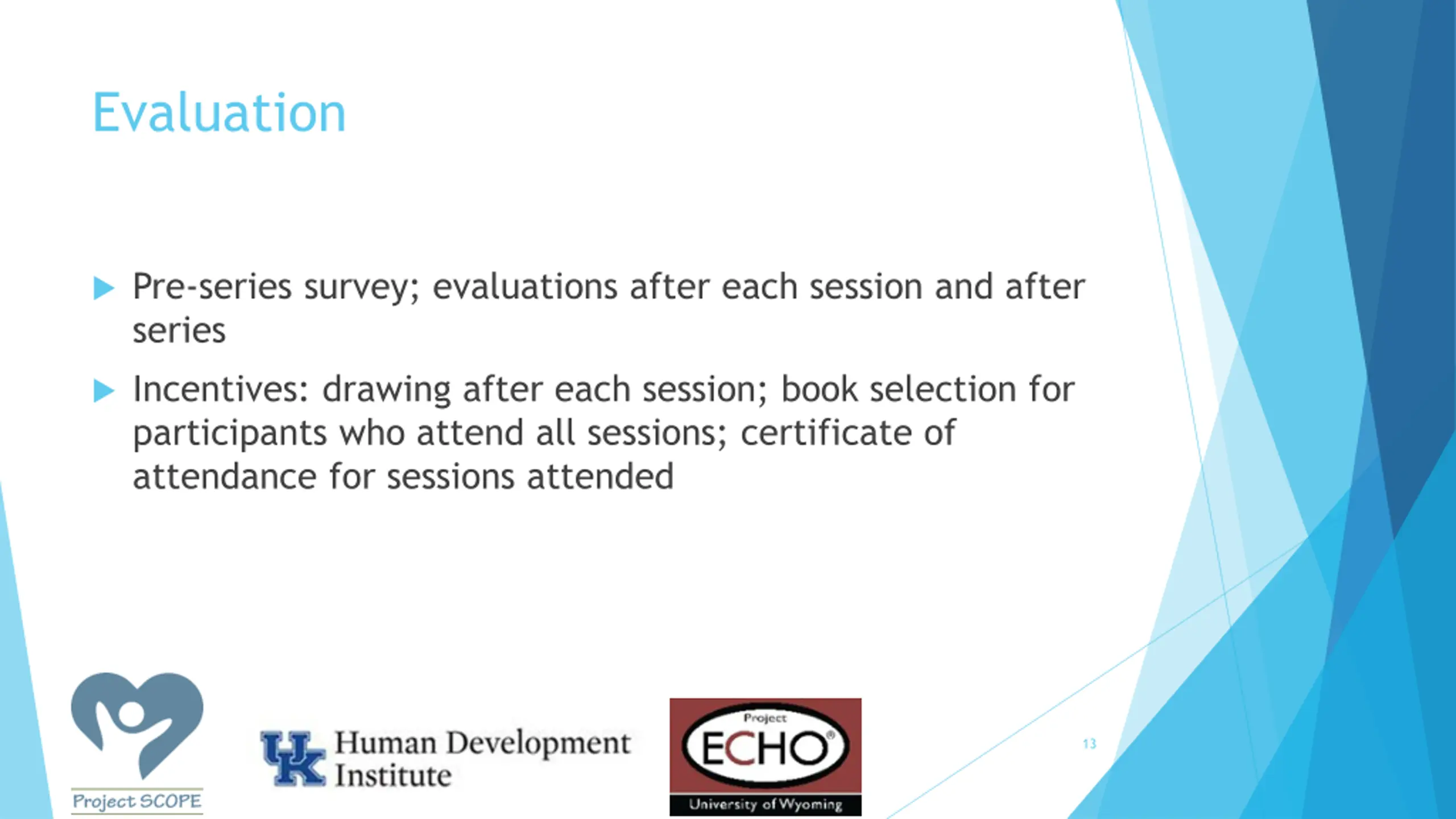 Evaluation Pre-series survey; evaluations after each session and after series Incentives: drawing after each session; book selection for participants who attend all sessions; certificate of attendance for sessions attended 13