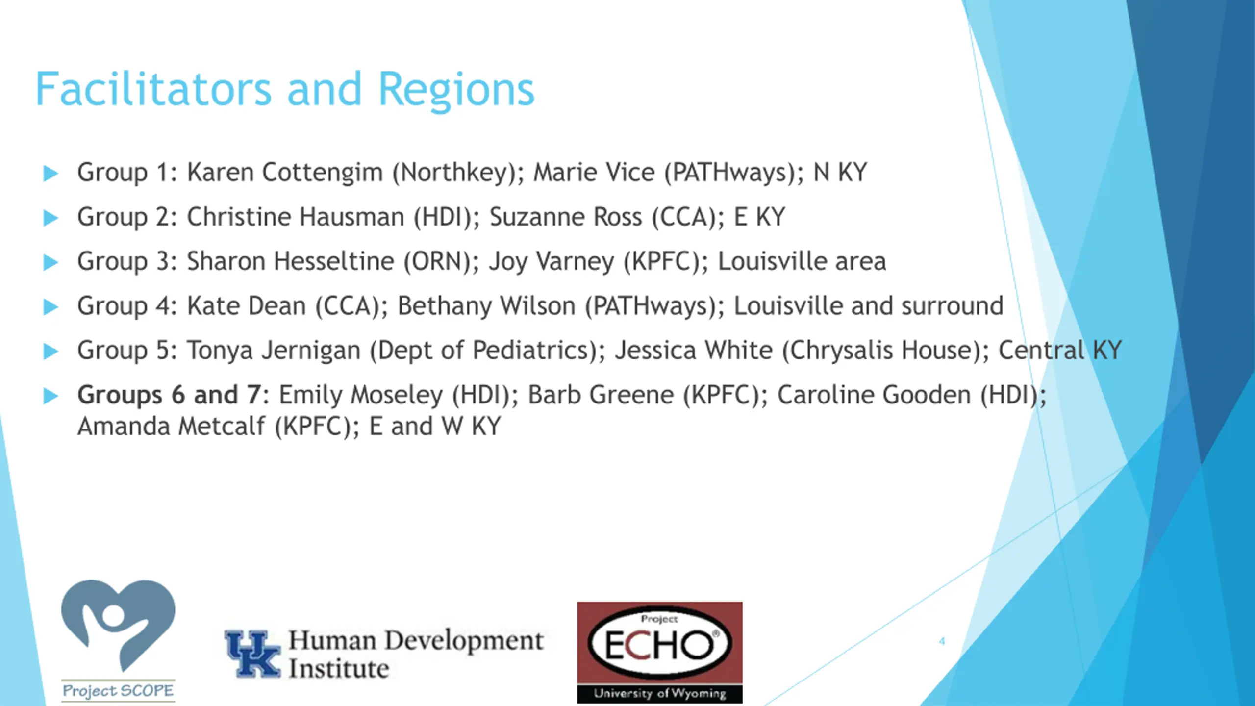 Facilitators and Regions Group 1: Karen Cottengim (Northkey); Marie Vice (PATHways); N KY Group 2: Christine Hausman (HDI); Suzanne Ross (CCA); E KY Group 3: Sharon Hesseltine (ORN); Joy Varney (KPFC); Louisville area Group 4: Kate Dean (CCA); Bethany Wilson (PATHways); Louisville and surround Group 5: Tonya Jernigan (Dept of Pediatrics);Jessica White (Chrysalis House); Central KY Groups 6 and 7: Emily Moseley (HDI); Barb Greene (KPFC); Caroline Gooden (HDI); Amanda Metcalf (KPFC); E and W KY 4