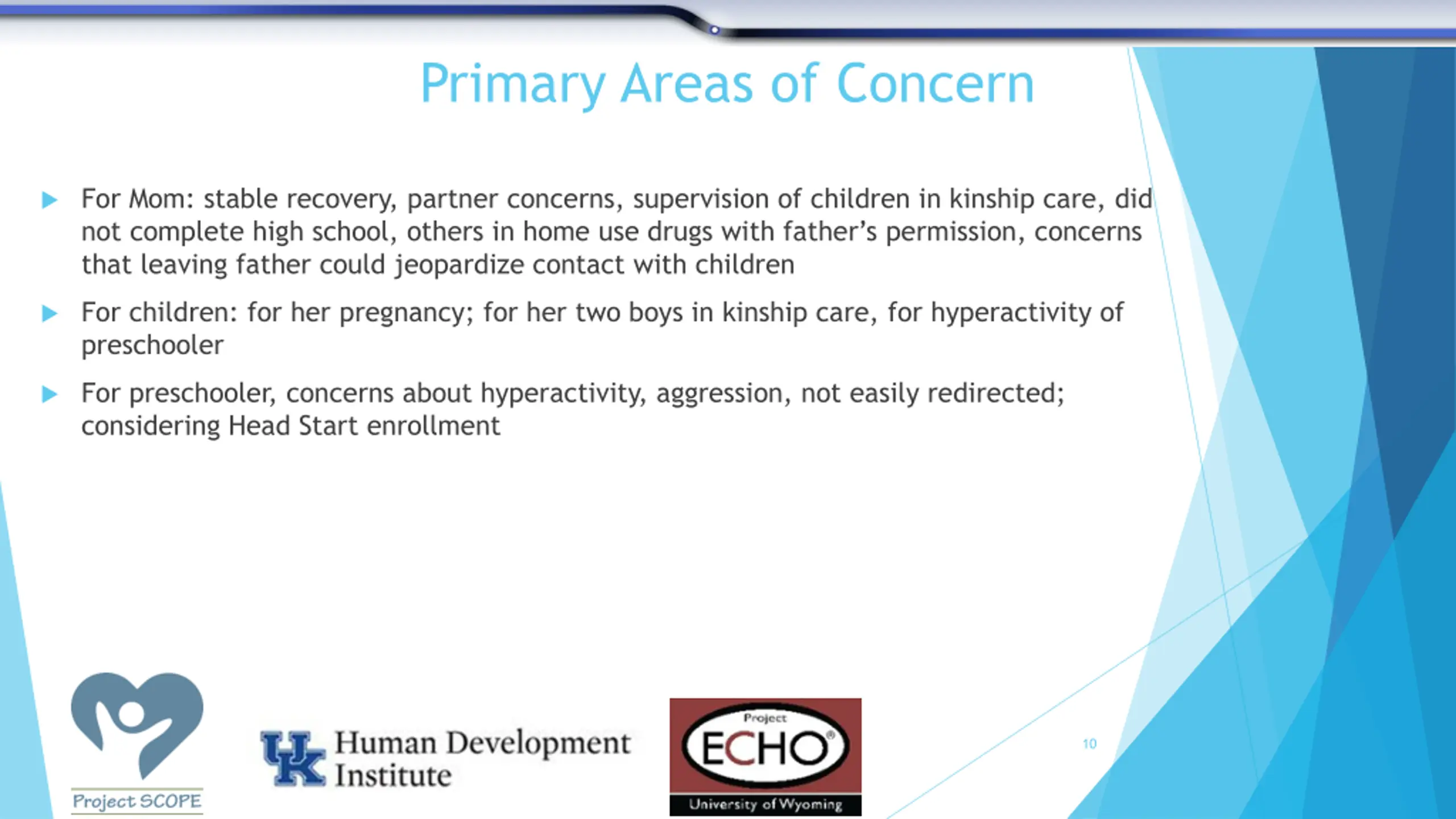 Primary Areas of Concern For Mom: stable recovery, partner concerns, supervision of children in kinship care, did not complete high school, others in home use drugs with father s permission, concerns that leaving father could jeopardize contact with children For children: for her pregnancy; for her two boys in kinship care, for hyperactivity of preschooler For preschooler, concerns about hyperactivity, aggression, not easily redirected; considering Head Start enrollment 10
