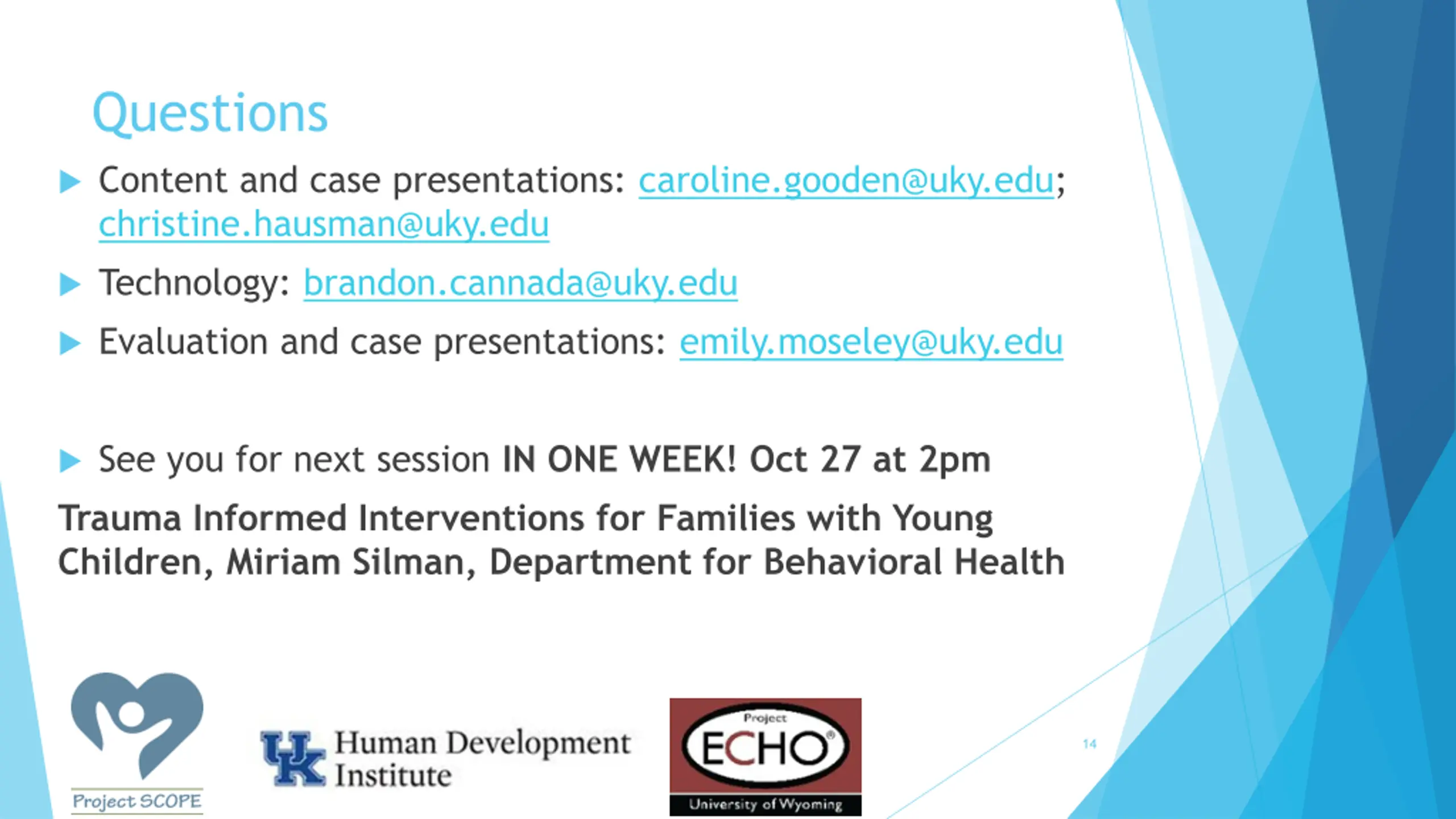 Questions Content and case presentations: caroline.gooden@uky.edu; christine.hausman@uky.edu Technology: brandon.cannada@uky.edu Evaluation and case presentations: emily.moseley@uky.edu See you for next session IN ONE WEEK! Oct 27 at 2pm Trauma Informed Interventions for Families with Young Children, Miriam Silman, Department for Behavioral Health 14
