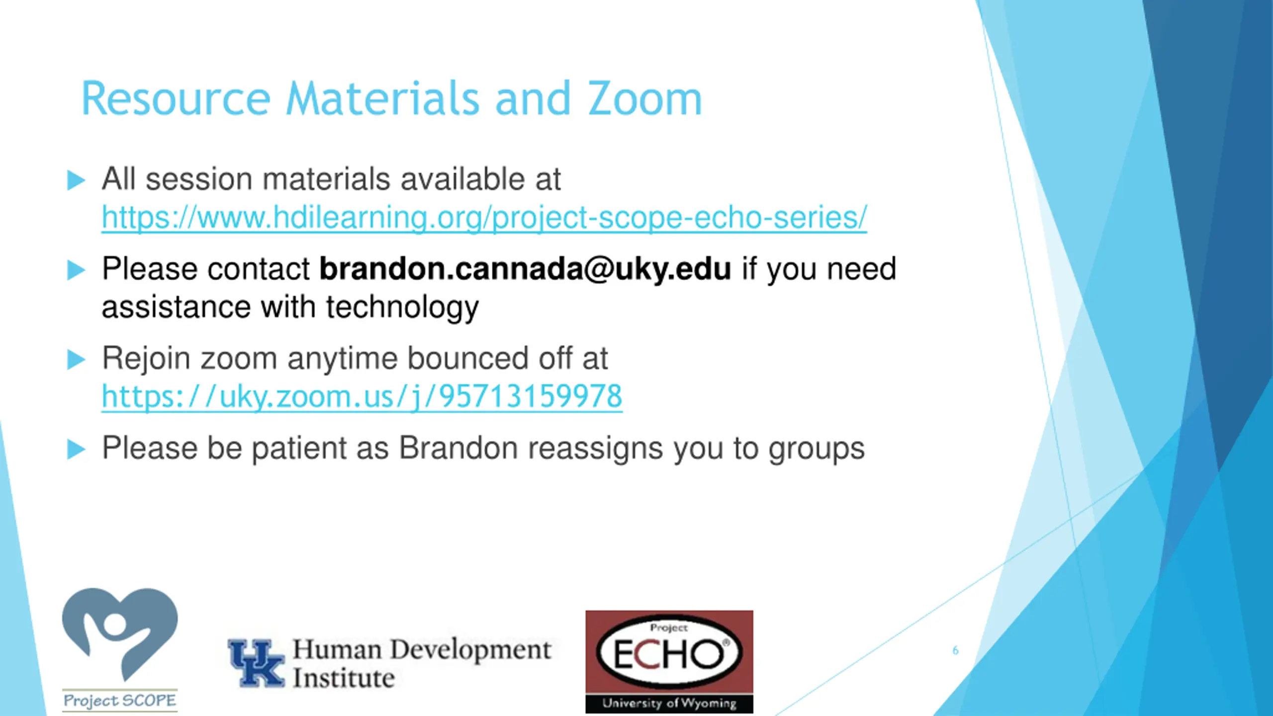 Resource Materials and Zoom All session materials available at https://www.hdilearning.org/project-scope-echo-series/ Please contact brandon.cannada@uky.edu if you need assistance with technology Rejoin zoom anytime bounced off at https://uky.zoom.us/j/95713159978 Please be patient as Brandon reassigns you to groups 6
