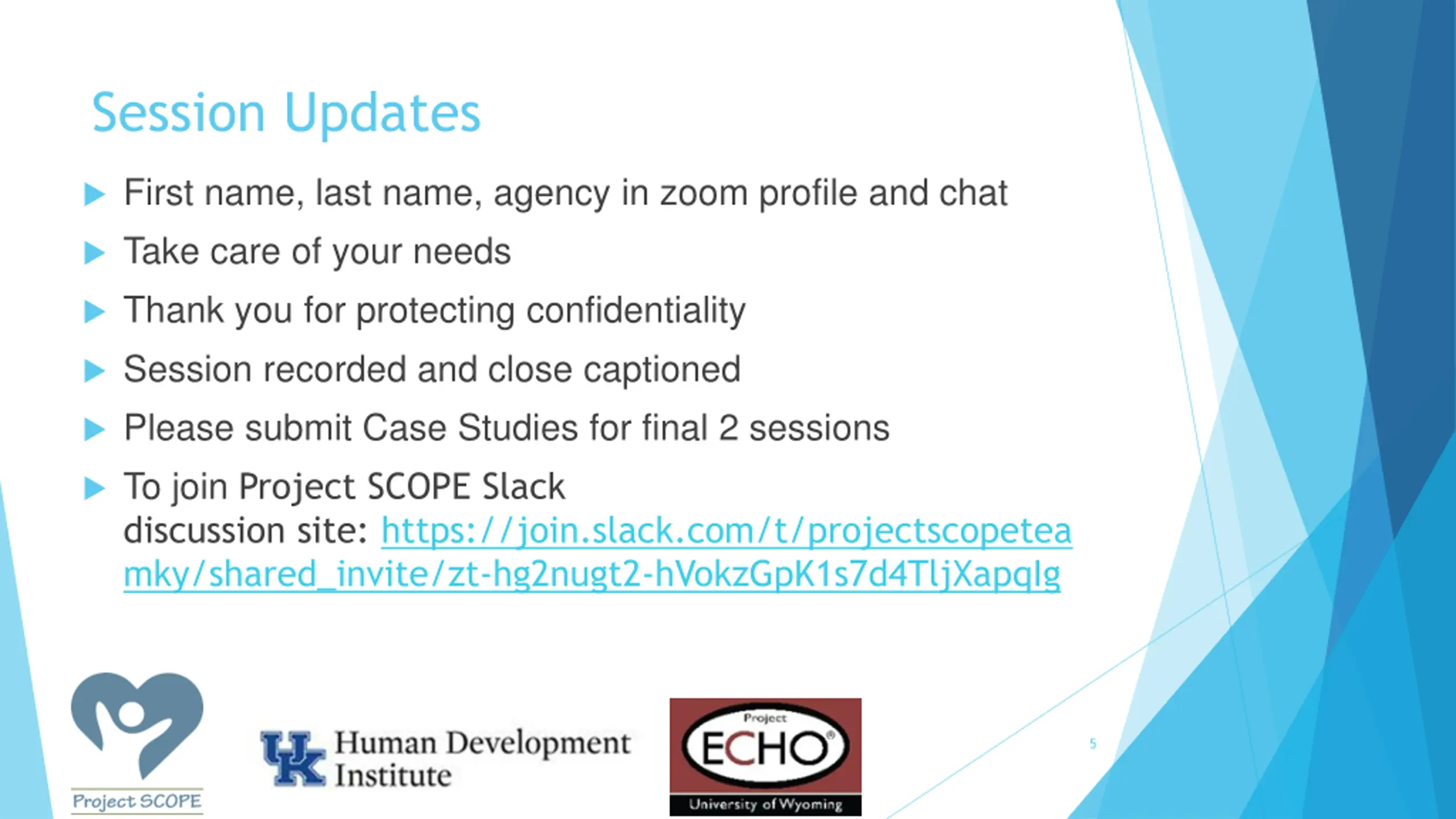 Session Updates First name, last name, agency in zoom profile and chat Take care of your needs Thank you for protecting confidentiality Session recorded and close captioned Please submit Case Studies for final 2 sessions To join Project SCOPE Slack discussion site: https://join.slack.com/t/projectscopetea mky/shared_invite/zt-hg2nugt2-hVokzGpK1s7d4TljXapqIg 5