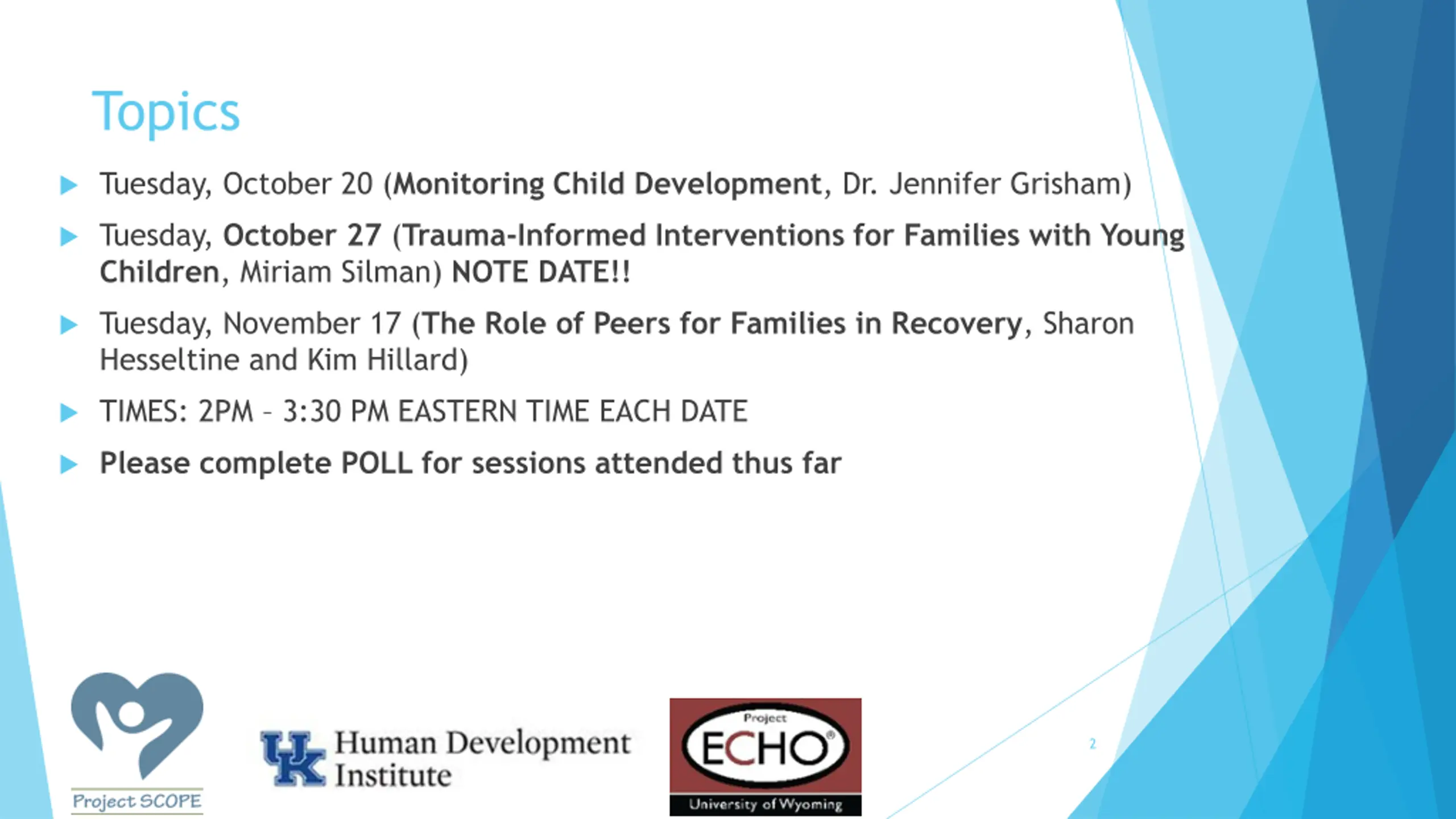 Topics Tuesday, October 20 (Monitoring Child Development, Dr. Jennifer Grisham) Tuesday, October 27 (Trauma-Informed Interventions for Families with Young Children, Miriam Silman) NOTE DATE!! Tuesday, November 17 (The Role of Peers for Families in Recovery, Sharon Hesseltine and Kim Hillard) TIMES: 2PM 3:30 PM EASTERN TIME EACH DATE Please complete POLL for sessions attended thus far 2