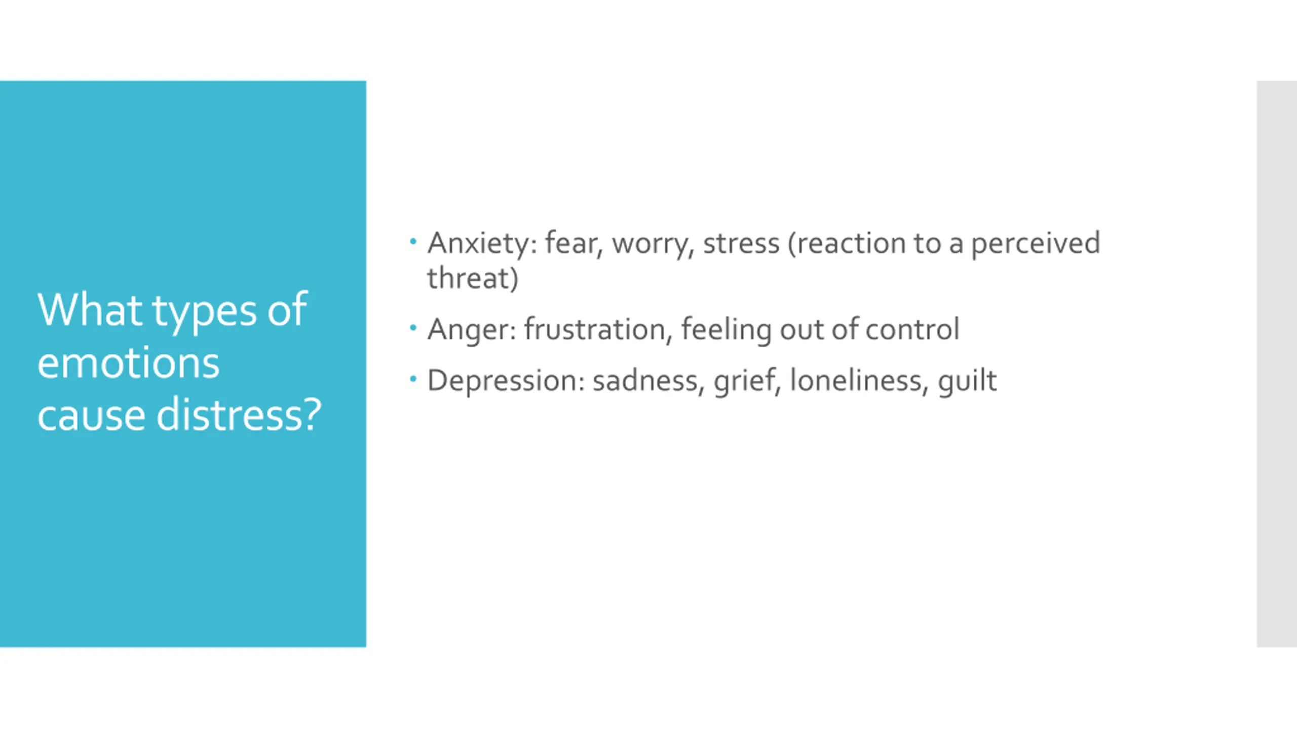 Anxiety: fear, worry, stress (reaction to a perceived threat) Anger: frustration, feeling out of control Depression: sadness, grief, loneliness, guilt What types of emotions cause distress?
