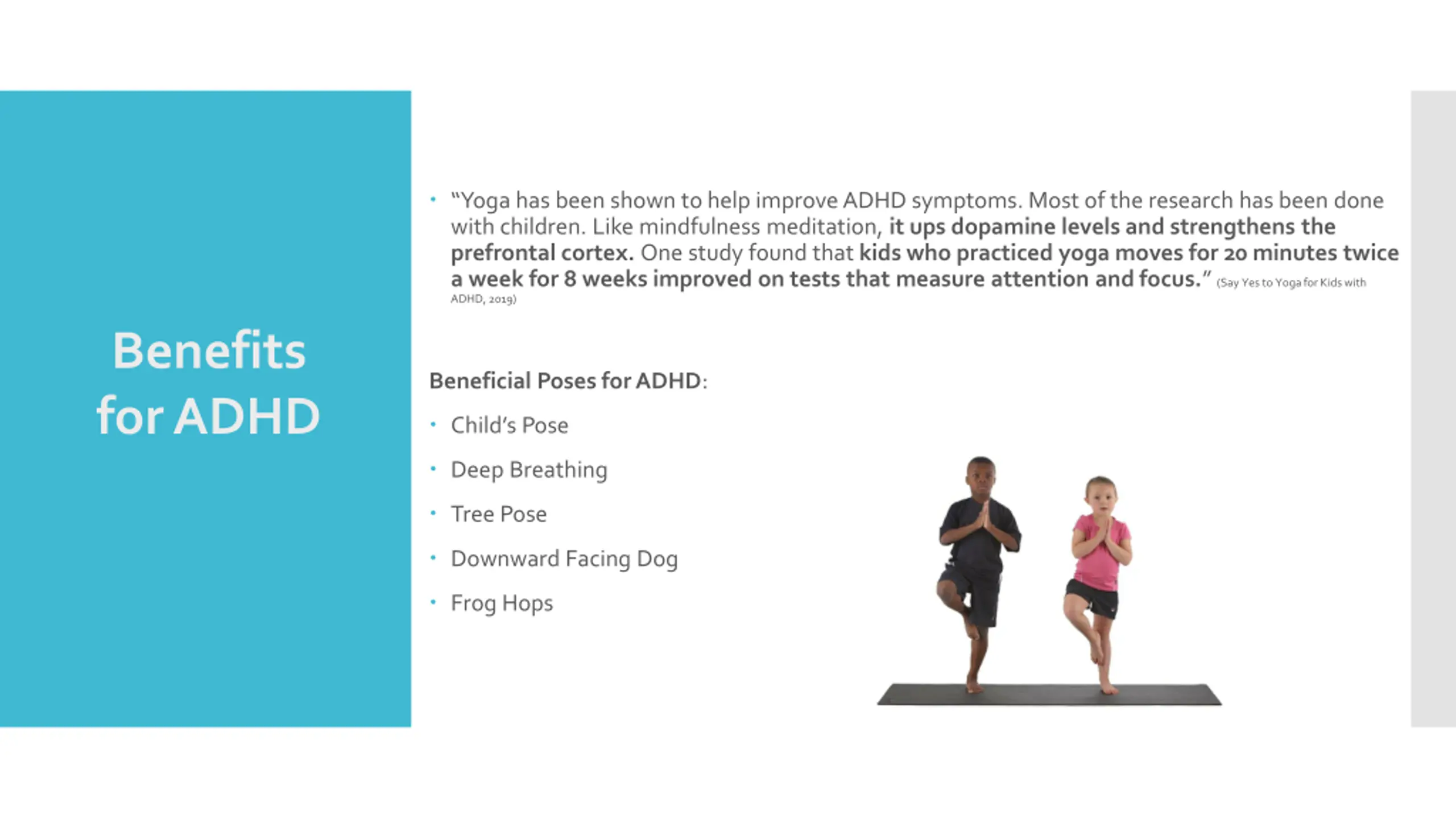 Benefits for ADHD Yoga has been shown to help improve ADHD symptoms. Most of the research has been done with children. Like mindfulness meditation, it ups dopamine levels and strengthens the prefrontal cortex. One study found that kids who practiced yoga moves for 20 minutes twice a week for 8 weeks improved on tests that measure attention and focus. (Say Yes to Yoga for Kids with ADHD, 2019) Benefits for ADHD Beneficial Poses for ADHD: Child s Pose Deep Breathing Tree Pose Downward Facing Dog Frog Hops