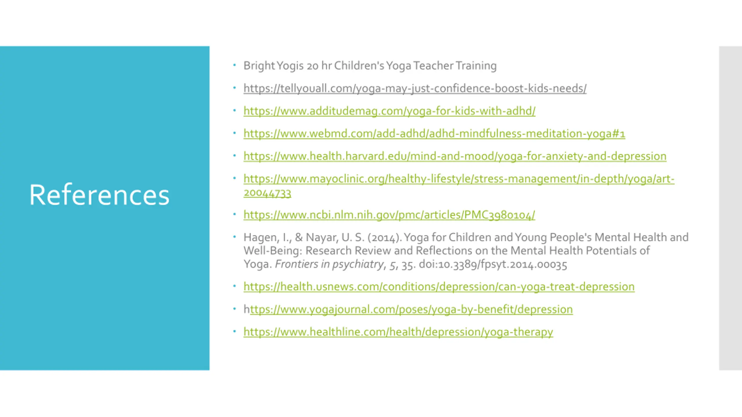 Bright Yogis 20 hr Children's Yoga Teacher Training References https://tellyouall.com/yoga-may-just-confidence-boost-kids-needs/ https://www.additudemag.com/yoga-for-kids-with-adhd/ https://www.webmd.com/add-adhd/adhd-mindfulness-meditation-yoga#1 https://www.health.harvard.edu/mind-and-mood/yoga-for-anxiety-and-depression https://www.mayoclinic.org/healthy-lifestyle/stress-management/in-depth/yoga/art- 20044733 References https://www.ncbi.nlm.nih.gov/pmc/articles/PMC3980104/ Hagen, I., & Nayar, U. S. (2014). Yoga for Children and Young People's Mental Health and Well-Being: Research Review and Reflections on the Mental Health Potentials of Yoga. Frontiers in psychiatry, 5, 35. doi:10.3389/fpsyt.2014.00035 https://health.usnews.com/conditions/depression/can-yoga-treat-depression https://www.yogajournal.com/poses/yoga-by-benefit/depression https://www.healthline.com/health/depression/yoga-therapy