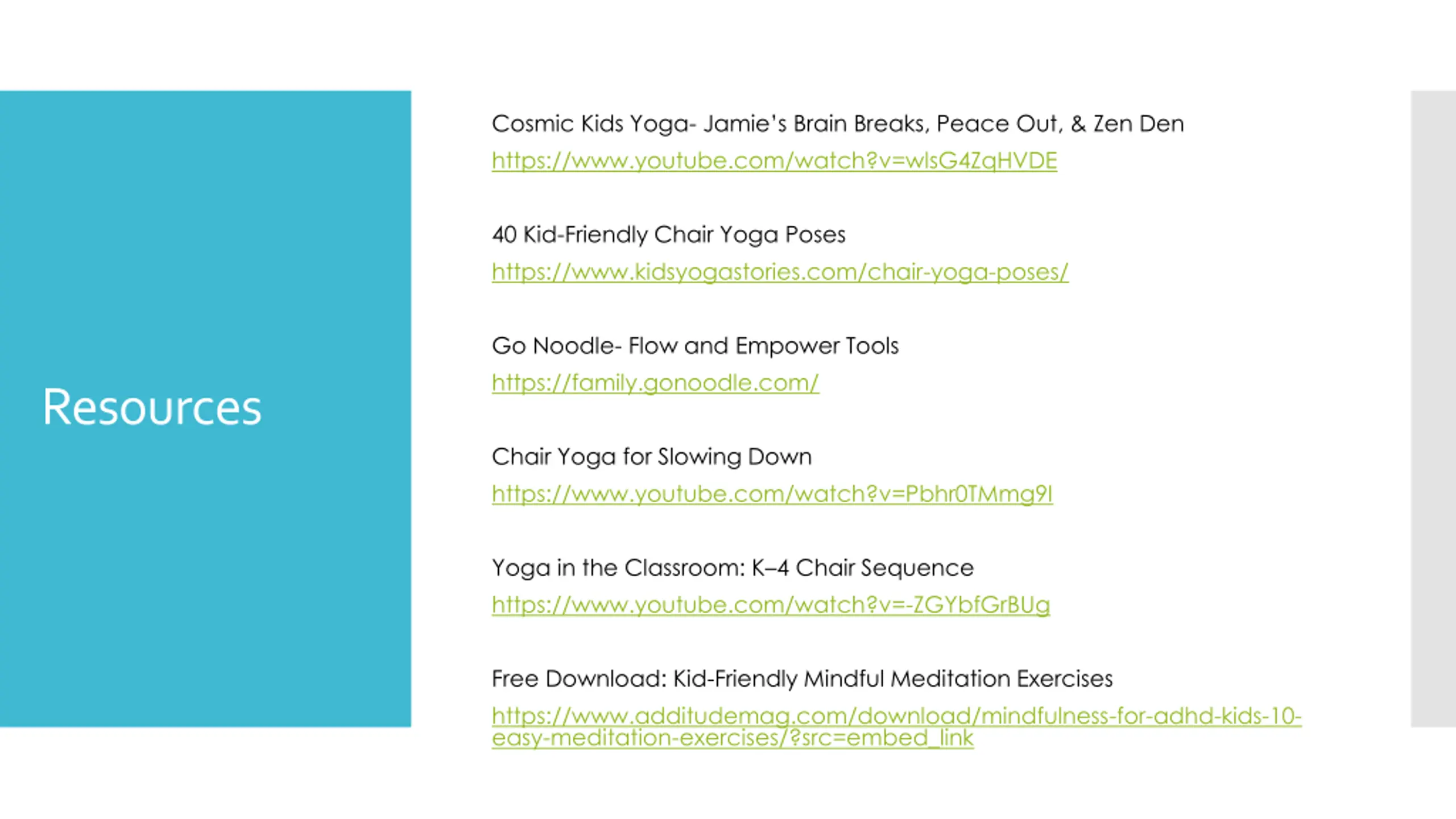 Cosmic Kids Yoga- Jamies Brain Breaks, Peace Out, & Zen Den https://www.youtube.com/watch?v=wlsG4ZqHVDE 40 Kid-Friendly Chair Yoga Poses https://www.kidsyogastories.com/chair-yoga-poses/ Go Noodle- Flow and Empower Tools https://family.gonoodle.com/ Resources Chair Yoga for Slowing Down https://www.youtube.com/watch?v=Pbhr0TMmg9I Yoga in the Classroom: K 4 Chair Sequence https://www.youtube.com/watch?v=-ZGYbfGrBUg Free Download: Kid-Friendly Mindful Meditation Exercises https://www.additudemag.com/download/mindfulness-for-adhd-kids-10- easy-meditation-exercises/?src=embed_link