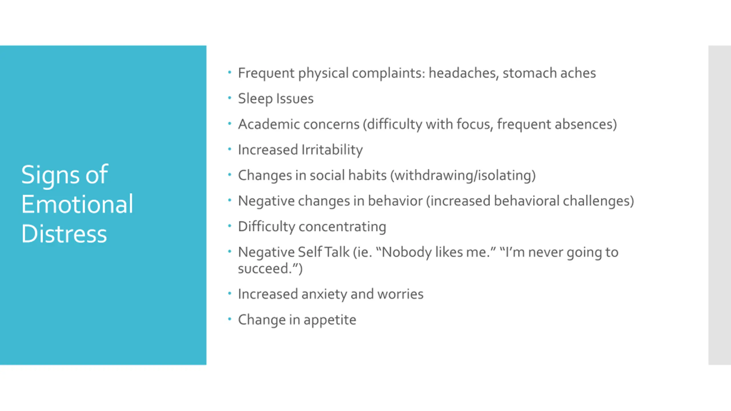 Frequent physical complaints: headaches, stomach aches Sleep Issues Academic concerns (difficulty with focus, frequent absences) Increased Irritability Signs of Emotional Distress Changes in social habits (withdrawing/isolating) Negative changes in behavior (increased behavioral challenges) Difficulty concentrating Negative Self Talk (ie. Nobody likes me. I m never going to succeed. ) Increased anxiety and worries Change in appetite