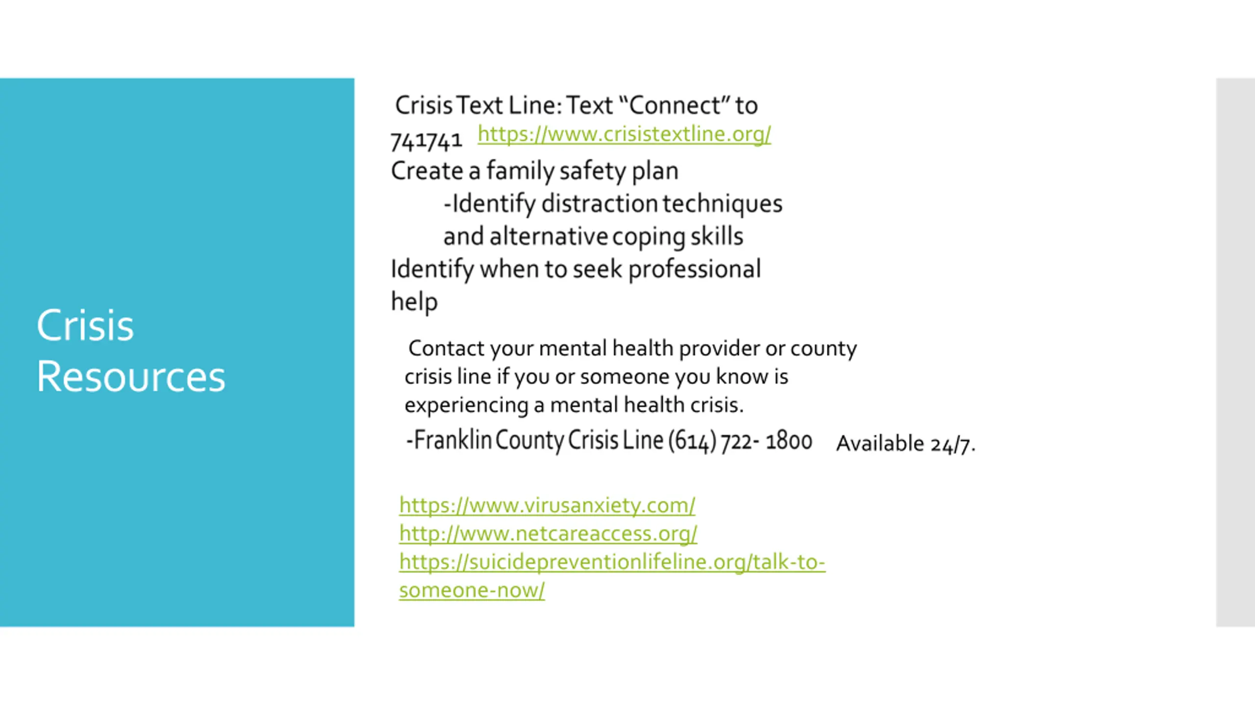 https://www.crisistextline.org/ Crisis Resources Contact your mental health provider or county crisis line if you or someone you know is experiencing a mental health crisis. Available 24/7. https://www.virusanxiety.com/ http://www.netcareaccess.org/ https://suicidepreventionlifeline.org/talk-to- someone-now/