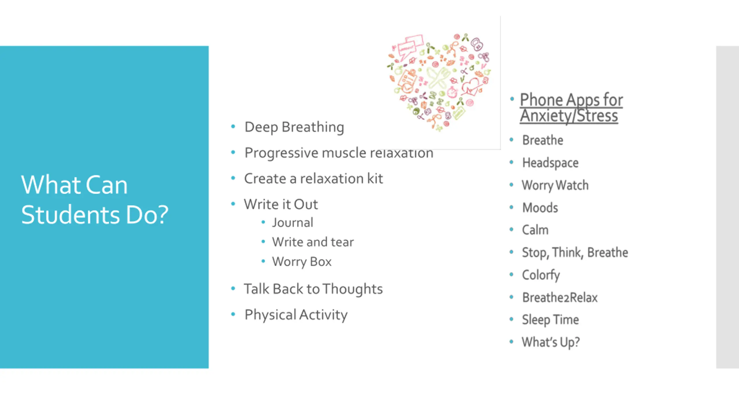 Image result for self care clipart Deep Breathing Progressive muscle relaxation Create a relaxation kit What Can Students Do? Write it Out Journal Write and tear Worry Box Talk Back to Thoughts Physical Activity