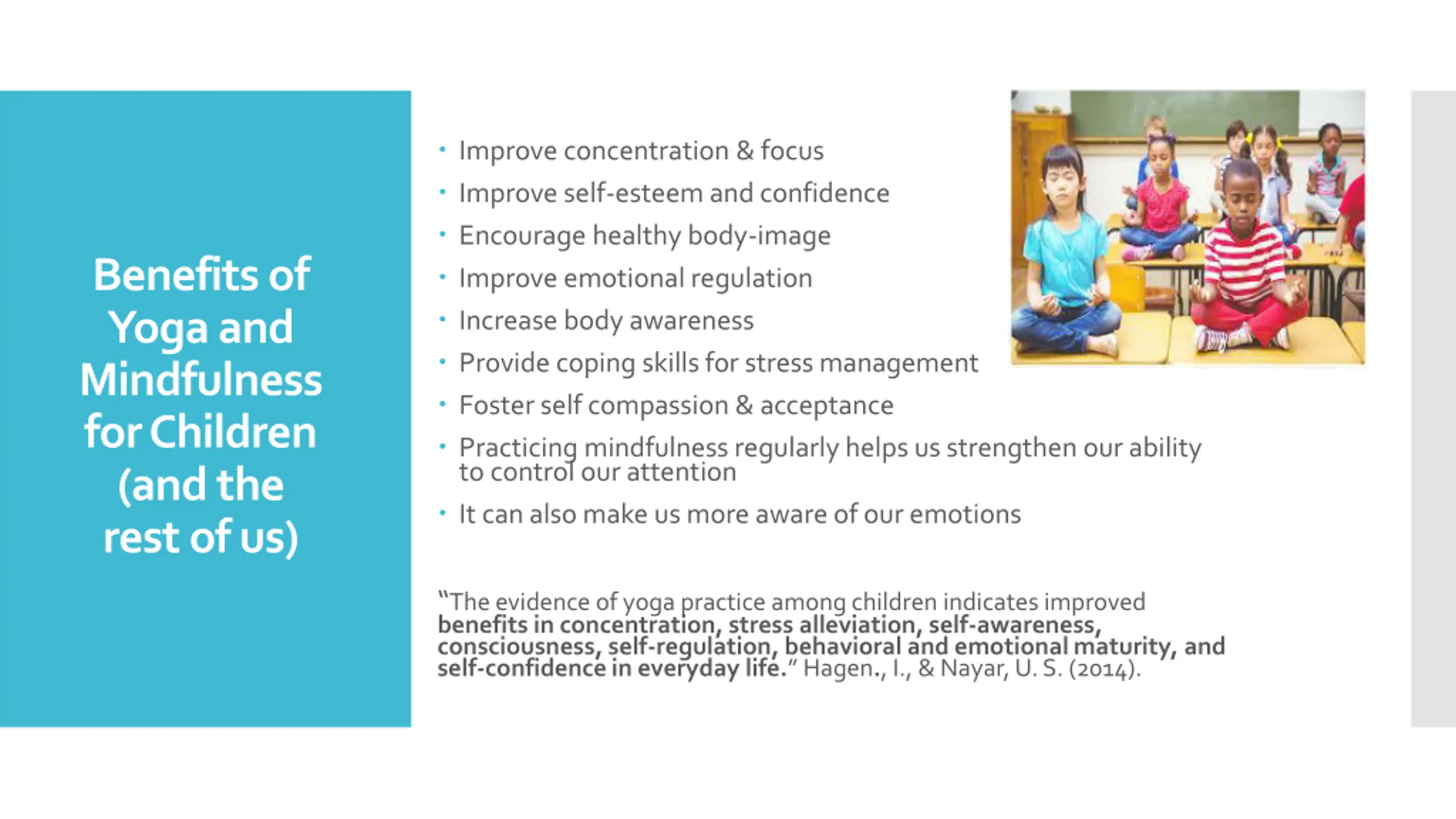 Improve concentration & focus Improve self-esteem and confidence Encourage healthy body-image Improve emotional regulation Increase body awareness Provide coping skills for stress management Foster self compassion & acceptance Practicing mindfulness regularly helps us strengthen our ability to control our attention It can also make us more aware of our emotions Benefits of Yoga and Mindfulness for Children (and the rest of us) The evidence of yoga practice among children indicates improved benefits in concentration, stress alleviation, self-awareness, consciousness, self-regulation, behavioral and emotional maturity, and self-confidence in everyday life. Hagen., I., & Nayar, U. S. (2014).