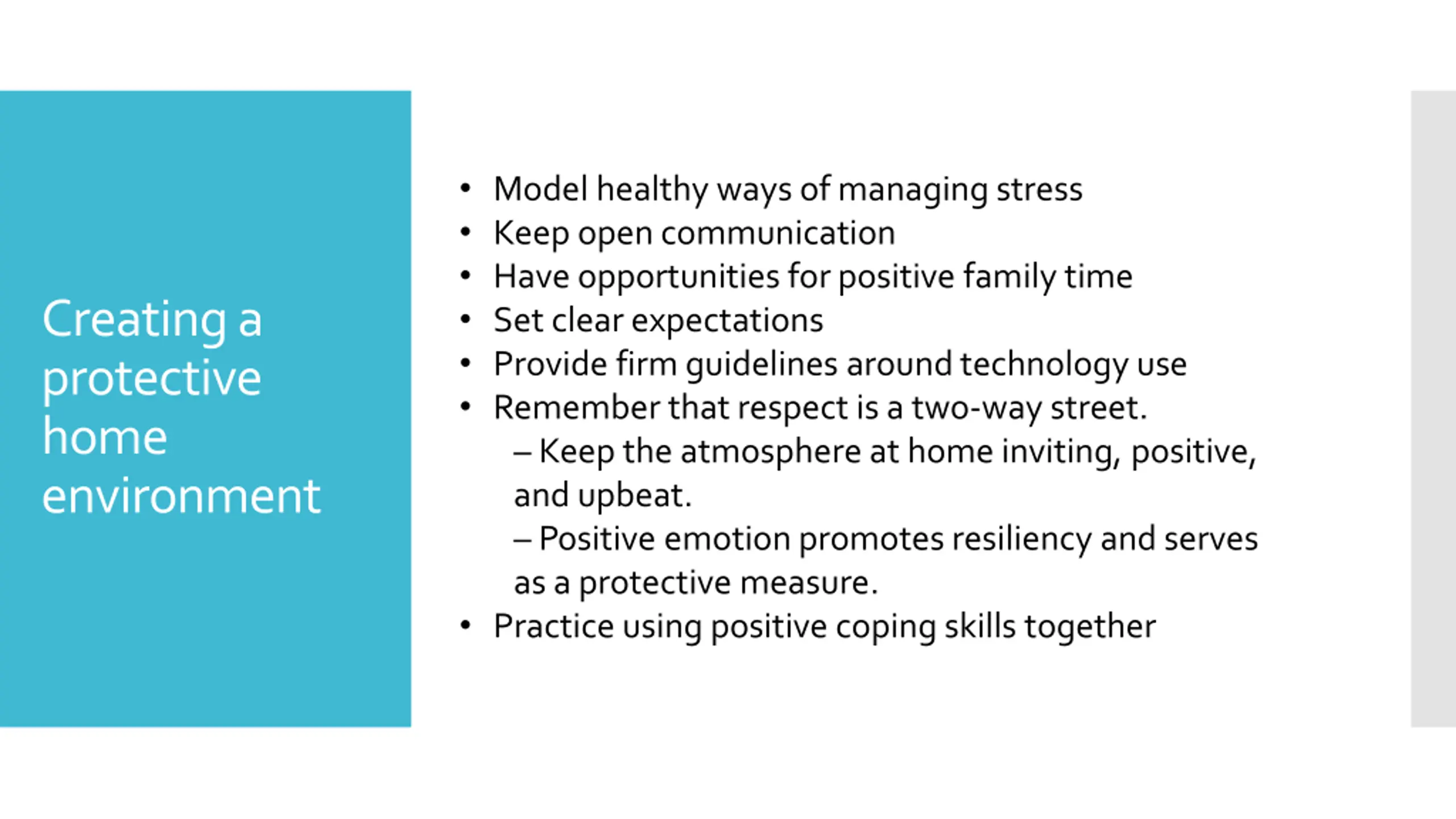 Model healthy ways of managing stress Keep open communication Have opportunities for positive family time Set clear expectations Provide firm guidelines around technology use Remember that respect is a two-way street. Keep the atmosphere at home inviting, positive, and upbeat. Positive emotion promotes resiliency and serves as a protective measure. Practice using positive coping skills together Creating a protective home environment