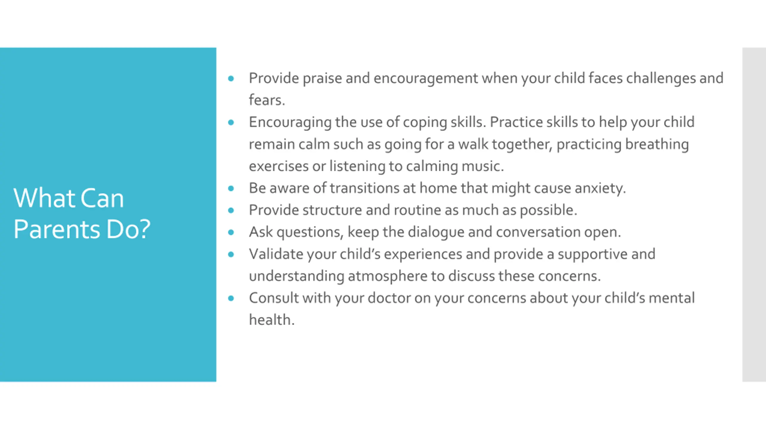 Provide praise and encouragement when your child faces challenges and fears. Encouraging the use of coping skills. Practice skills to help your child remain calm such as going for a walk together, practicing breathing exercises or listening to calming music. Be aware of transitions at home that might cause anxiety. Provide structure and routine as much as possible. Ask questions, keep the dialogue and conversation open. Validate your child s experiences and provide a supportive and understanding atmosphere to discuss these concerns. Consult with your doctor on your concerns about your child s mental health. What Can Parents Do?