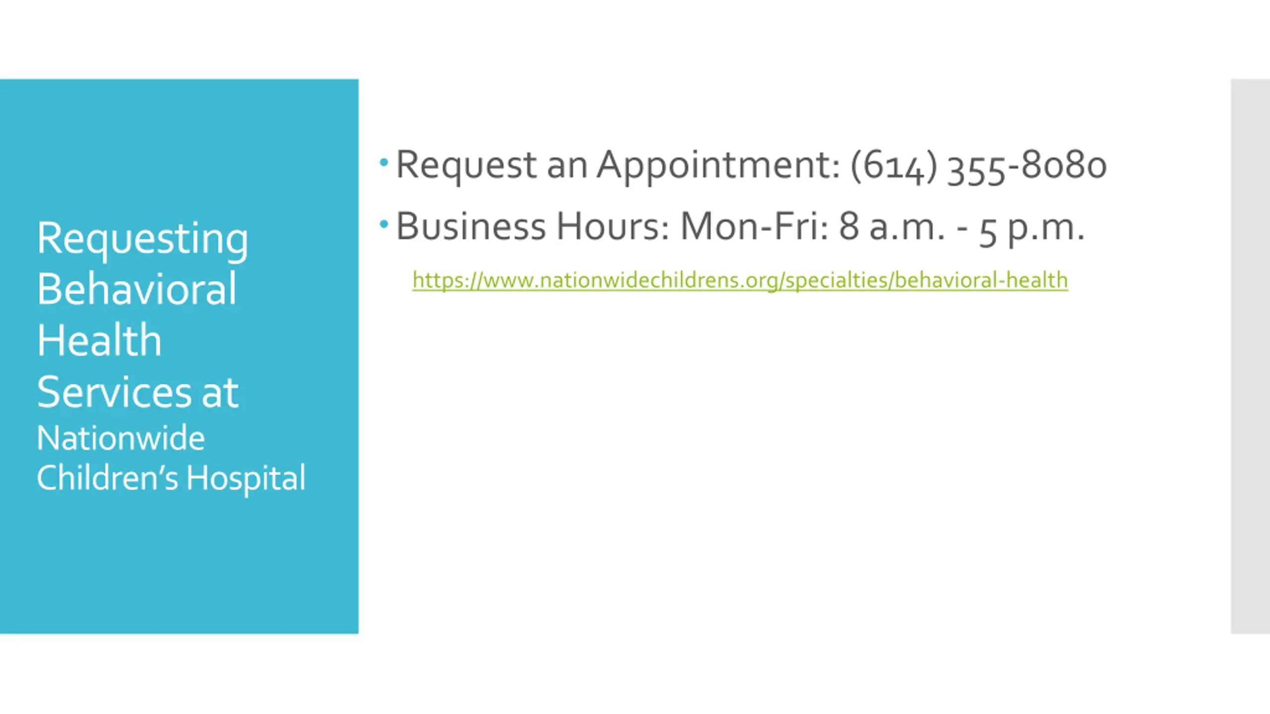 Request an Appointment: (614) 355-8080 Business Hours: Mon-Fri: 8 a.m. - 5 p.m. Requesting Behavioral Health Services at Nationwide Children s Hospital https://www.nationwidechildrens.org/specialties/behavioral-health