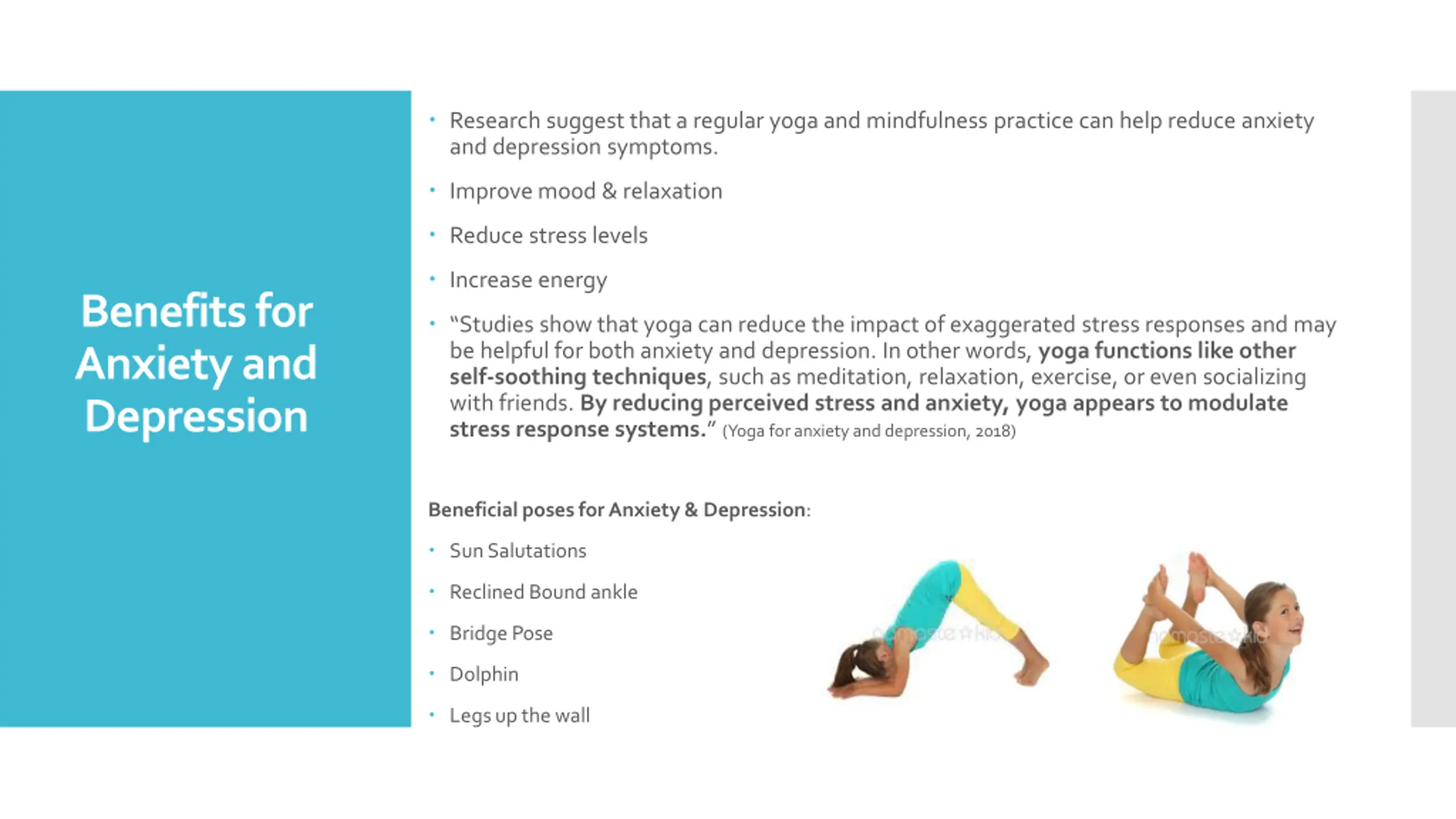 Research suggest that a regular yoga and mindfulness practice can help reduce anxiety and depression symptoms. Improve mood & relaxation Reduce stress levels Increase energy Benefits for Anxiety and Depression Studies show that yoga can reduce the impact of exaggerated stress responses and may be helpful for both anxiety and depression. In other words, yoga functions like other self-soothing techniques, such as meditation, relaxation, exercise, or even socializing with friends. By reducing perceived stress and anxiety, yoga appears to modulate stress response systems. (Yoga for anxiety and depression, 2018) Beneficial poses for Anxiety & Depression: Sun Salutations Reclined Bound ankle Bridge Pose Dolphin Legs up the wall