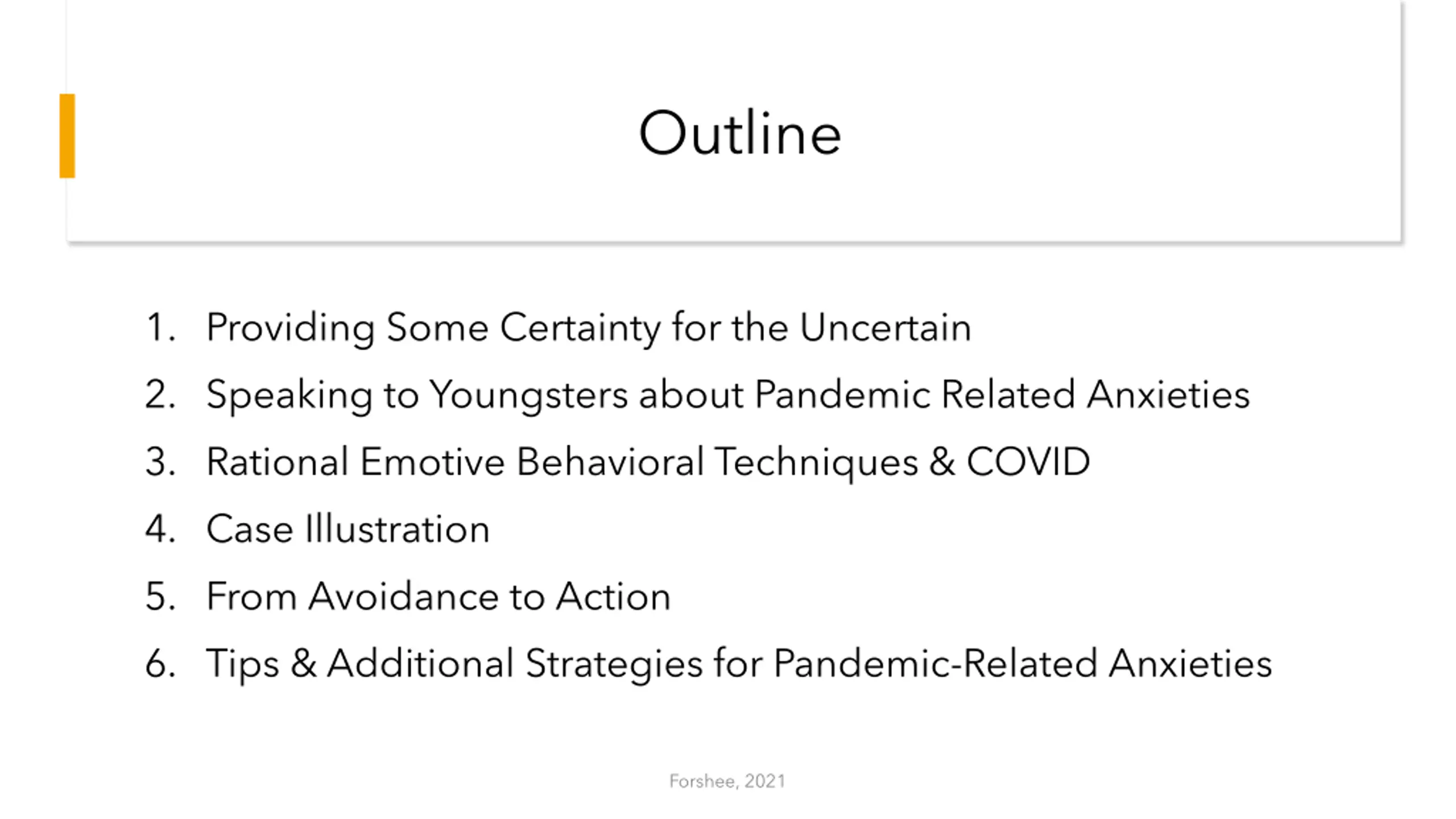 Outline 1. Providing Some Certainty for the Uncertain 2. Speaking to Youngsters about Pandemic Related Anxieties 3. Rational Emotive Behavioral Techniques & COVID 4. Case Illustration 5. From Avoidance to Action 6. Tips & Additional Strategies for Pandemic-Related Anxieties Forshee, 2021
