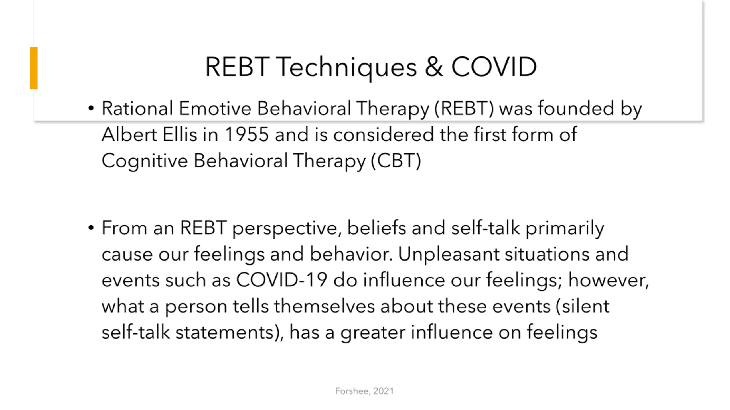 REBT Techniques & COVID Rational Emotive Behavioral Therapy (REBT) was founded by Albert Ellis in 1955 and is considered the first form of Cognitive Behavioral Therapy (CBT) From an REBT perspective, beliefs and self-talk primarily cause our feelings and behavior. Unpleasant situations and events such as COVID-19 do influence our feelings; however, what a person tells themselves about these events (silent self-talk statements), has a greater influence on feelings Forshee, 2021