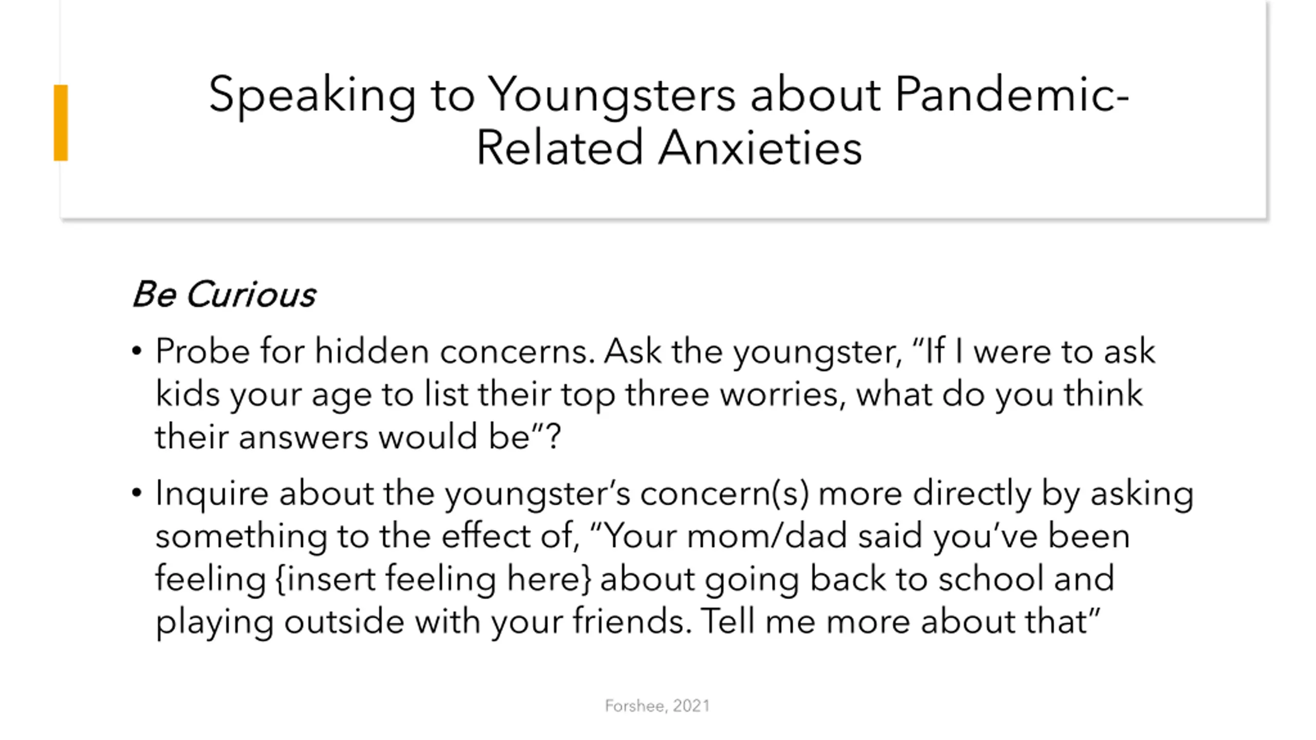 Speaking to Youngsters about Pandemic- Related Anxieties Be Curious Be Curious Probe for hidden concerns. Ask the youngster, If I were to ask kids your age to list their top three worries, what do you think their answers would be ? Inquire about the youngster s concern(s) more directly by asking something to the effect of, Your mom/dad said you ve been feeling {insert feeling here} about going back to school and playing outside with your friends. Tell me more about that Forshee, 2021