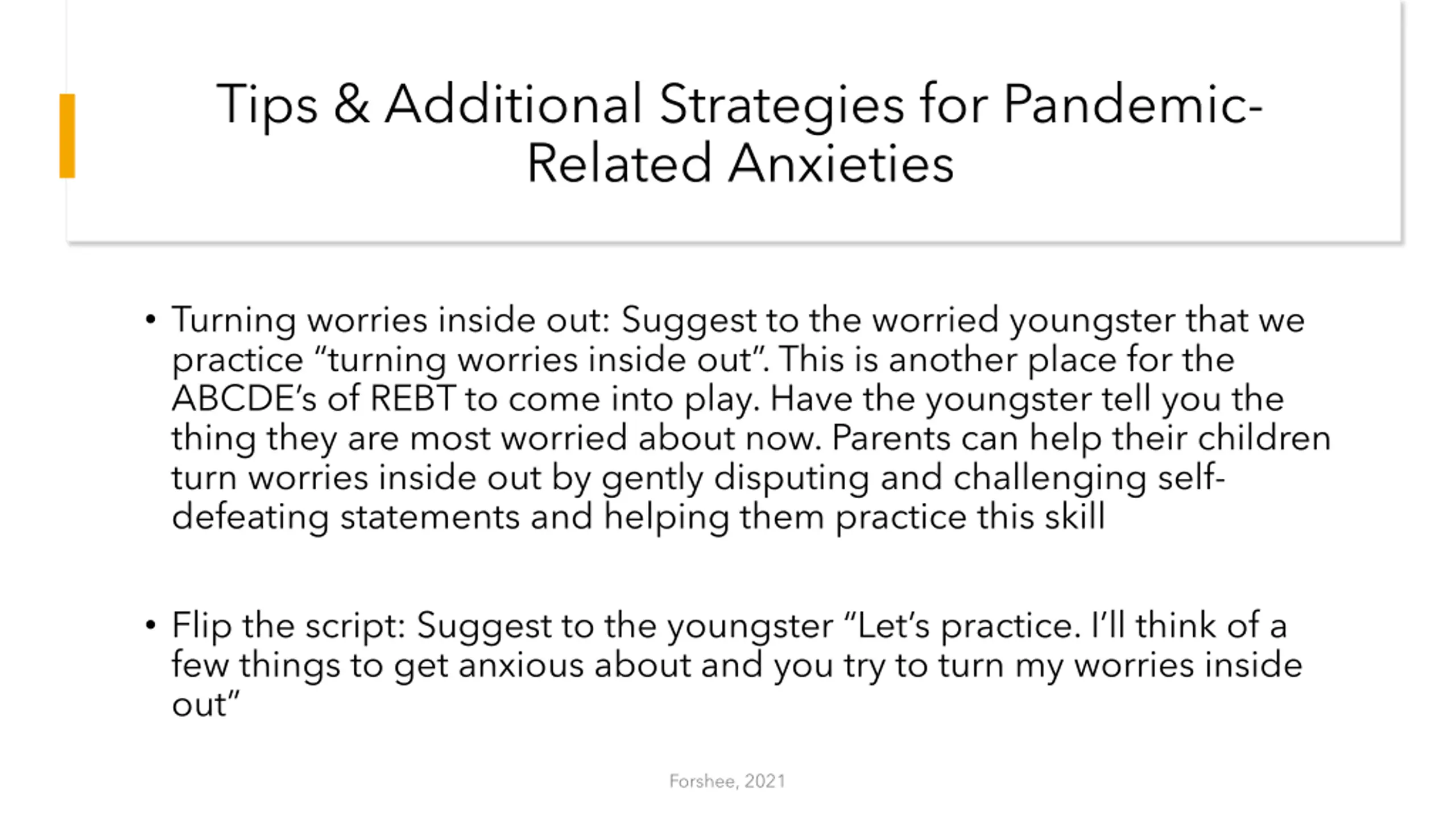 Tips & Additional Strategies for Pandemic- Related Anxieties Turning worries inside out: Suggest to the worried youngster that we practice turning worries inside out . This is another place for the ABCDE s of REBT to come into play. Have the youngster tell you the thing they are most worried about now. Parents can help their children turn worries inside out by gently disputing and challenging self- defeating statements and helping them practice this skill Flip the script: Suggest to the youngster Let s practice. I ll think of a few things to get anxious about and you try to turn my worries inside out Forshee, 2021