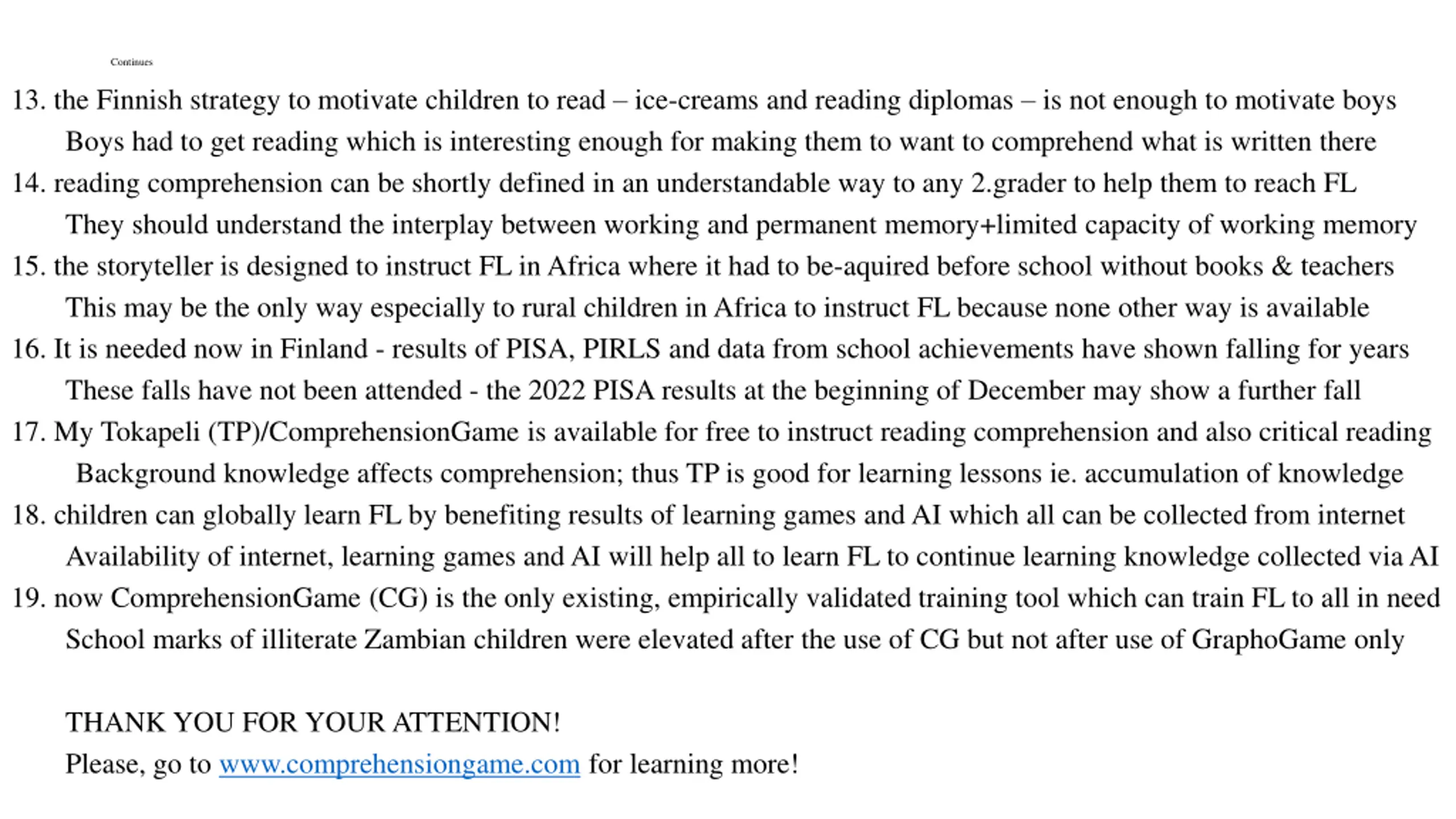 Continues 13. the Finnish strategy to motivate children to read ice-creams and reading diplomas is not enough to motivate boys Boys had to get reading which is interesting enough for making them to want to comprehend what is written there 14. reading comprehension can be shortly defined in an understandable way to any 2.grader to help them to reach FL They should understand the interplay between working and permanent memory+limited capacity of working memory 15. the storyteller is designed to instruct FL in Africa where it had to be-aquired before school without books & teachers This may be the only way especially to rural children in Africa to instruct FL because none other way is available 16. It is needed now in Finland - results of PISA, PIRLS and data from school achievements have shown falling for years These falls have not been attended - the 2022 PISA results at the beginning of December may show a further fall 17. My Tokapeli (TP)/ComprehensionGame is available for free to instruct reading comprehension and also critical reading Background knowledge affects comprehension; thus TP is good for learning lessons ie. accumulation of knowledge 18. children can globally learn FL by benefiting results of learning games and AI which all can be collected from internet Availability of internet, learning games and AI will help all to learn FL to continue learning knowledge collected via AI 19. now ComprehensionGame (CG) is the only existing, empirically validated training tool which can train FL to all in need School marks of illiterate Zambian children were elevated after the use of CG but not after use of GraphoGame only THANK YOU FOR YOUR ATTENTION! Please, go to www.comprehensiongame.com for learning more!