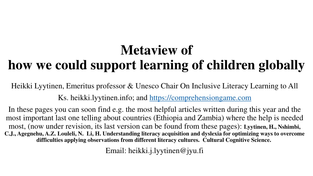 Metaview of how we could support learning of children globally Heikki Lyytinen, Emeritus professor & Unesco Chair On Inclusive Literacy Learning to All Ks. heikki.lyytinen.info; and https://comprehensiongame.com In these pages you can soon find e.g. the most helpful articles written during this year and the most important last one telling about countries (Ethiopia and Zambia) where the help is needed most, (now under revision, its last version can be found from these pages): Lyytinen, H., Nshimbi, C.J., Agegnehu, A.Z. Louleli, N. Li, H. Understanding literacy acquisition and dyslexia for optimizing ways to overcome difficulties applying observations from different literacy cultures. Cultural Cognitive Science. Email: heikki.j.lyytinen@jyu.fi