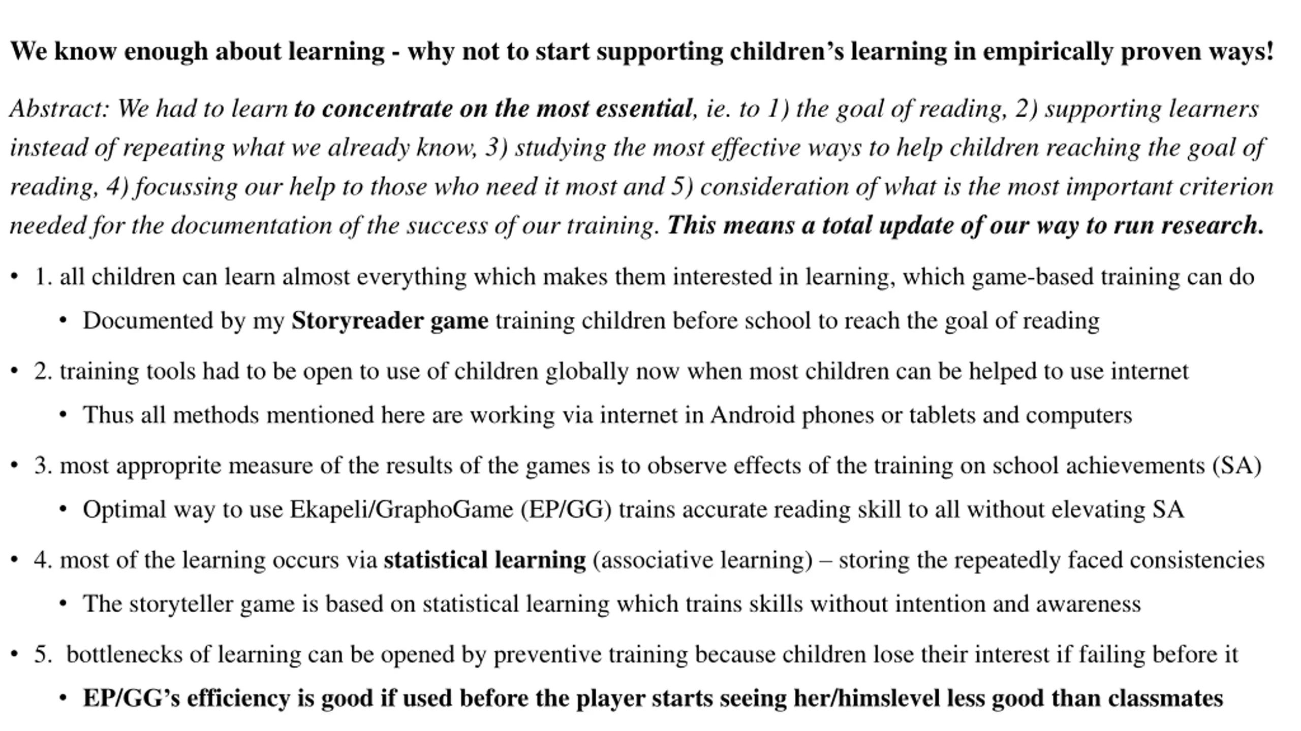 We know enough about learning - why not to start supporting childrens learning in empirically proven ways! Abstract: We had to learn to concentrate on the most essential, ie. to 1) the goal of reading, 2) supporting learners instead of repeating what we already know, 3) studying the most effective ways to help children reaching the goal of reading, 4) focussing our help to those who need it most and 5) consideration of what is the most important criterion needed for the documentation of the success of our training. This means a total update of our way to run research. 1. all children can learn almost everything which makes them interested in learning, which game-based training can do Documented by my Storyreader game training children before school to reach the goal of reading 2. training tools had to be open to use of children globally now when most children can be helped to use internet Thus all methods mentioned here are working via internet in Android phones or tablets and computers 3. most approprite measure of the results of the games is to observe effects of the training on school achievements (SA) Optimal way to use Ekapeli/GraphoGame (EP/GG) trains accurate reading skill to all without elevating SA 4. most of the learning occurs via statistical learning (associative learning) storing the repeatedly faced consistencies The storyteller game is based on statistical learning which trains skills without intention and awareness 5. bottlenecks of learning can be opened by preventive training because children lose their interest if failing before it EP/GG s efficiency is good if used before the player starts seeing her/himslevel less good than classmates