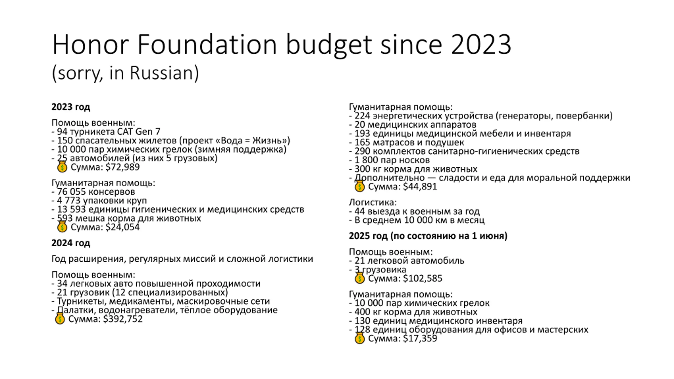 Honor Foundation One of many grass-roots organizations supporting the defense effort through volunteer work and international donations. Primary contact: [removed]. Primary goal: providing direct, honest, and timely aid to those who are at the epicenter of the tragedy: on the front, under occupation, in evacuation, in trouble. Weekly deliveries of goods: 6,000 miles driven per month Military: vehicles, equipment, medical supplies, cold-weather supplies Civilians: aid to evacuees, elderly, and families in need Children: presents, rehabilitation aids, basic aid Animals: feed, transportation, support of shelters Total budget: $650,000 since 2022.