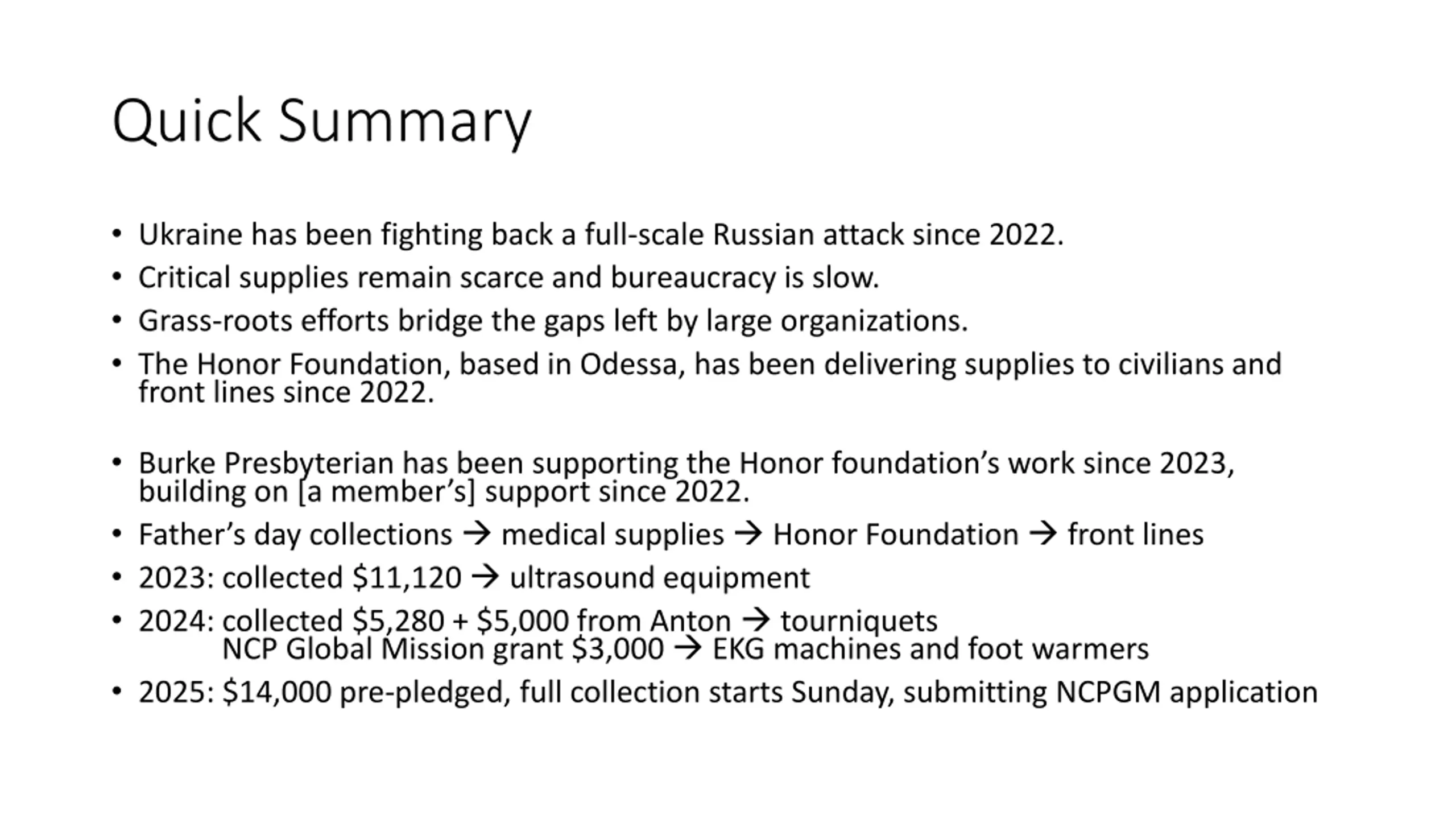 Quick Summary Ukraine has been fighting back a full-scale Russian attack since 2022. Critical supplies remain scarce and bureaucracy is slow. Grass-roots efforts bridge the gaps left by large organizations. The Honor Foundation, based in Odessa, has been delivering supplies to civilians and front lines since 2022. Burke Presbyterian has been supporting the Honor foundation s work since 2023, building on [a member s] support since 2022. Father s day collections medical supplies Honor Foundation front lines 2023: collected $11,120 ultrasound equipment 2024: collected $5,280 + $5,000 from Anton tourniquets NCP Global Mission grant $3,000 EKG machines and foot warmers 2025: $14,000 pre-pledged, full collection starts Sunday, submitting NCPGM application