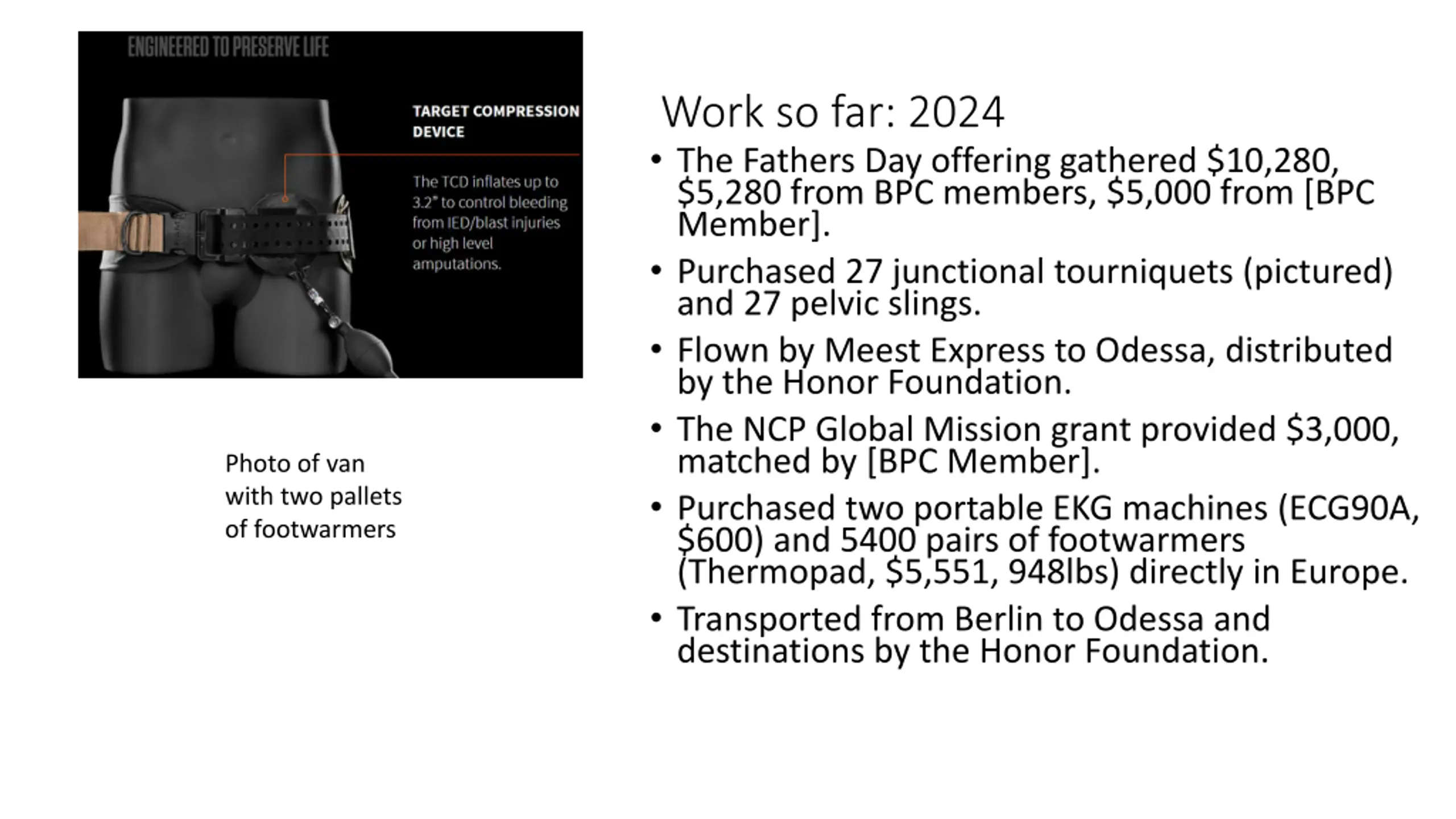 Work so far: 2024 The Fathers Day offering gathered $10,280, $5,280 from BPC members, $5,000 from [BPC Member]. Purchased 27 junctional tourniquets (pictured) and 27 pelvic slings. Flown by Meest Express to Odessa, distributed by the Honor Foundation. The NCP Global Mission grant provided $3,000, matched by [BPC Member]. Purchased two portable EKG machines (ECG90A, $600) and 5400 pairs of footwarmers (Thermopad, $5,551, 948lbs) directly in Europe. Transported from Berlin to Odessa and destinations by the Honor Foundation. Photo of van with two pallets of footwarmers