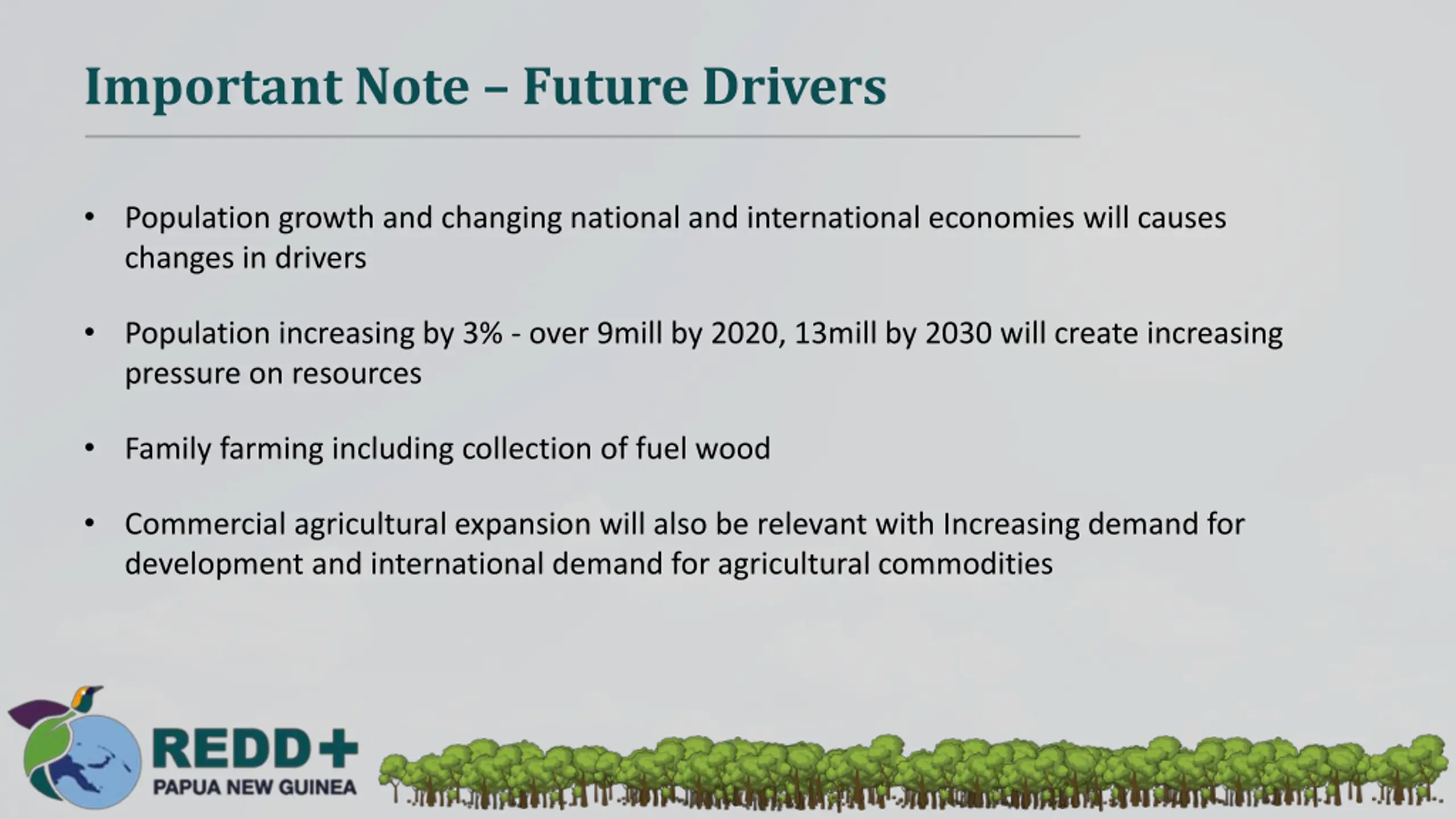 Important Note Future Drivers Population growth and changing national and international economies will causes changes in drivers Population increasing by 3% - over 9mill by 2020, 13mill by 2030 will create increasing pressure on resources Family farming including collection of fuel wood Commercial agricultural expansion will also be relevant with Increasing demand for development and international demand for agricultural commodities
