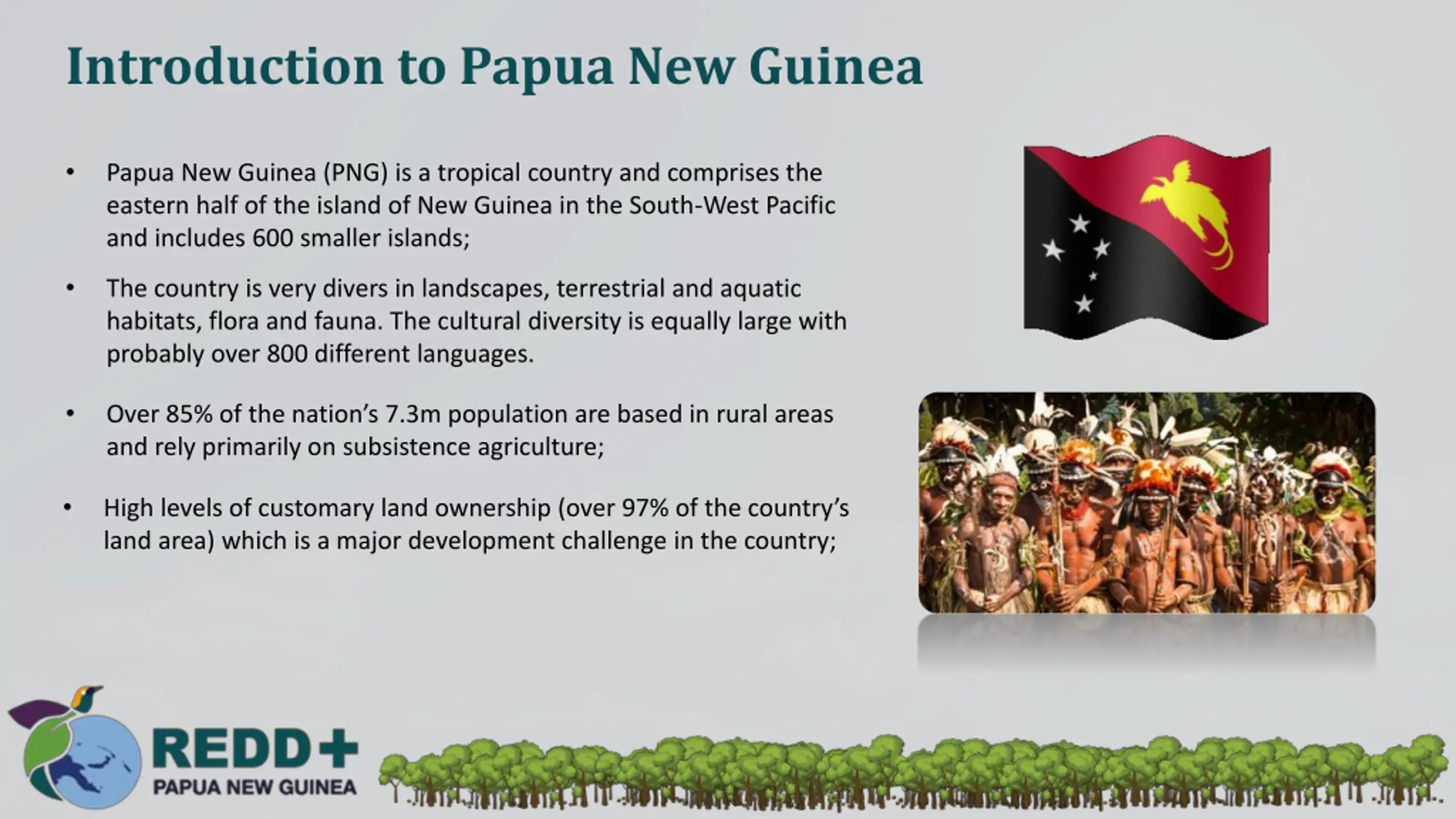 Papua New Guinea (PNG) is a diverse tropical country with a significant intact area of tropical forest, facing challenges from drivers like commercial logging and agriculture. The country's REDD+ program aims to address these challenges and promote sustainable development.