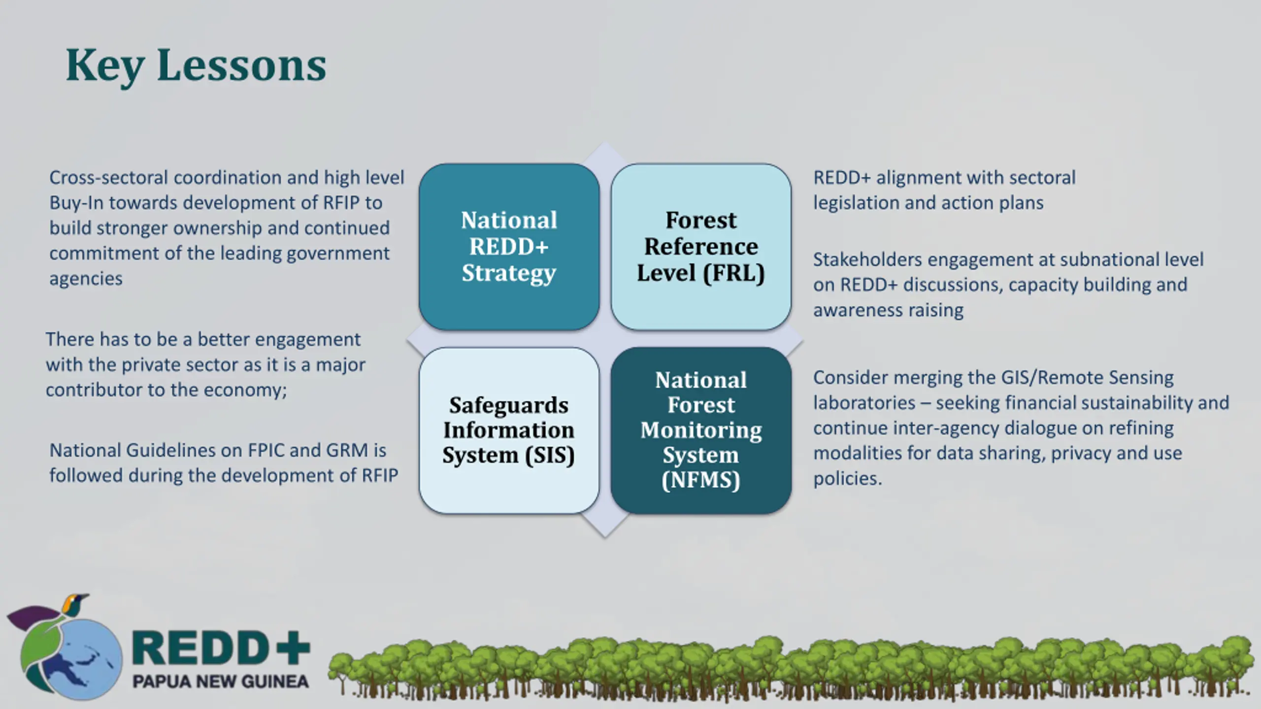 Key Lessons Cross-sectoral coordination and high level Buy-In towards development of RFIP to build stronger ownership and continued commitment of the leading government agencies REDD+ alignment with sectoral legislation and action plans National REDD+ Strategy Forest Reference Level (FRL) Stakeholders engagement at subnational level on REDD+ discussions, capacity building and awareness raising There has to be a better engagement with the private sector as it is a major contributor to the economy; National Forest Monitoring System (NFMS) Consider merging the GIS/Remote Sensing laboratories seeking financial sustainability and continue inter-agency dialogue on refining modalities for data sharing, privacy and use policies. Safeguards Information System (SIS) National Guidelines on FPIC and GRM is followed during the development of RFIP