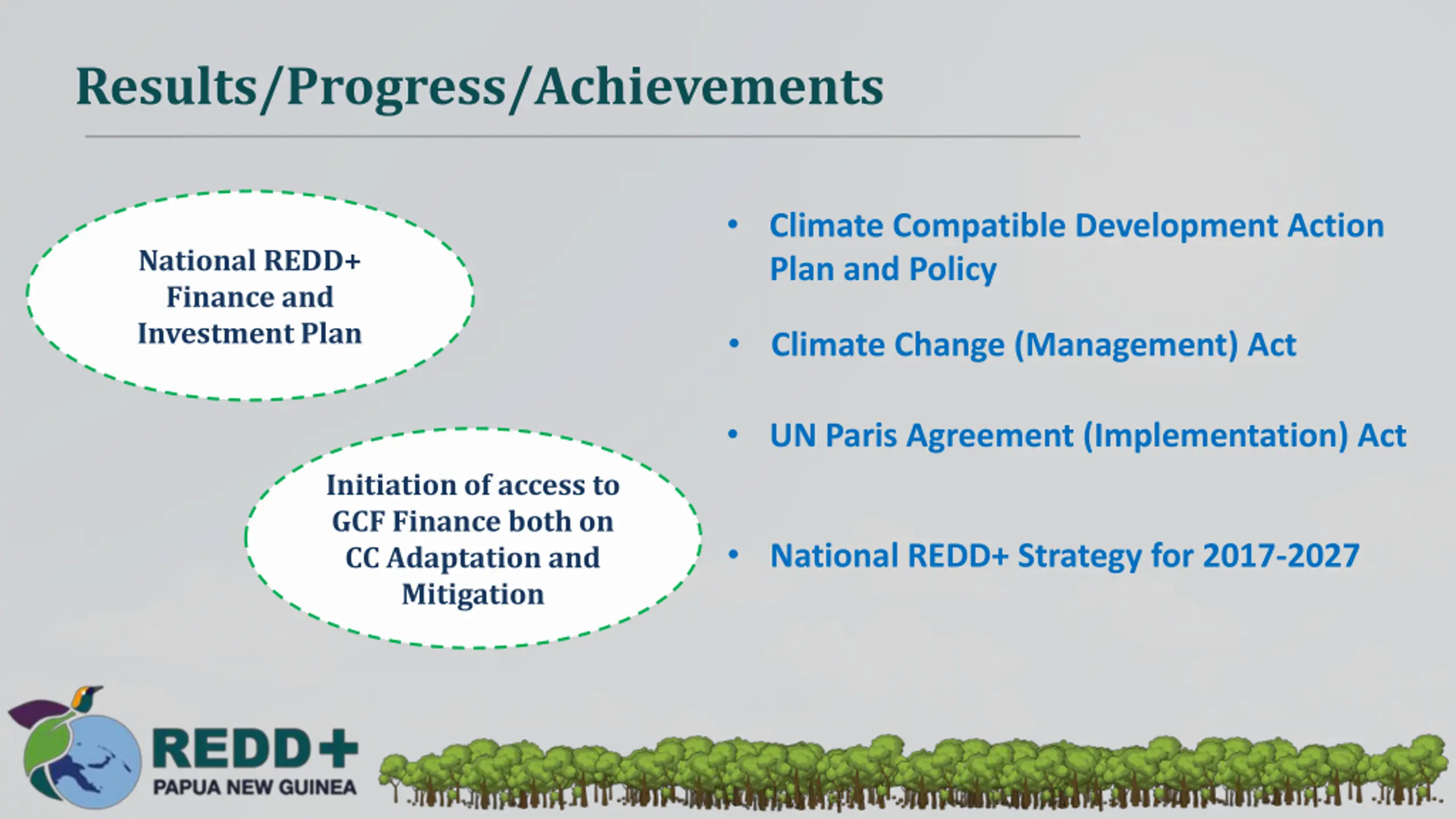 Results/Progress/Achievements Climate Compatible Development Action Plan and Policy National REDD+ Finance and Investment Plan Climate Change (Management) Act UN Paris Agreement (Implementation) Act Initiation of access to GCF Finance both on CC Adaptation and Mitigation National REDD+ Strategy for 2017-2027