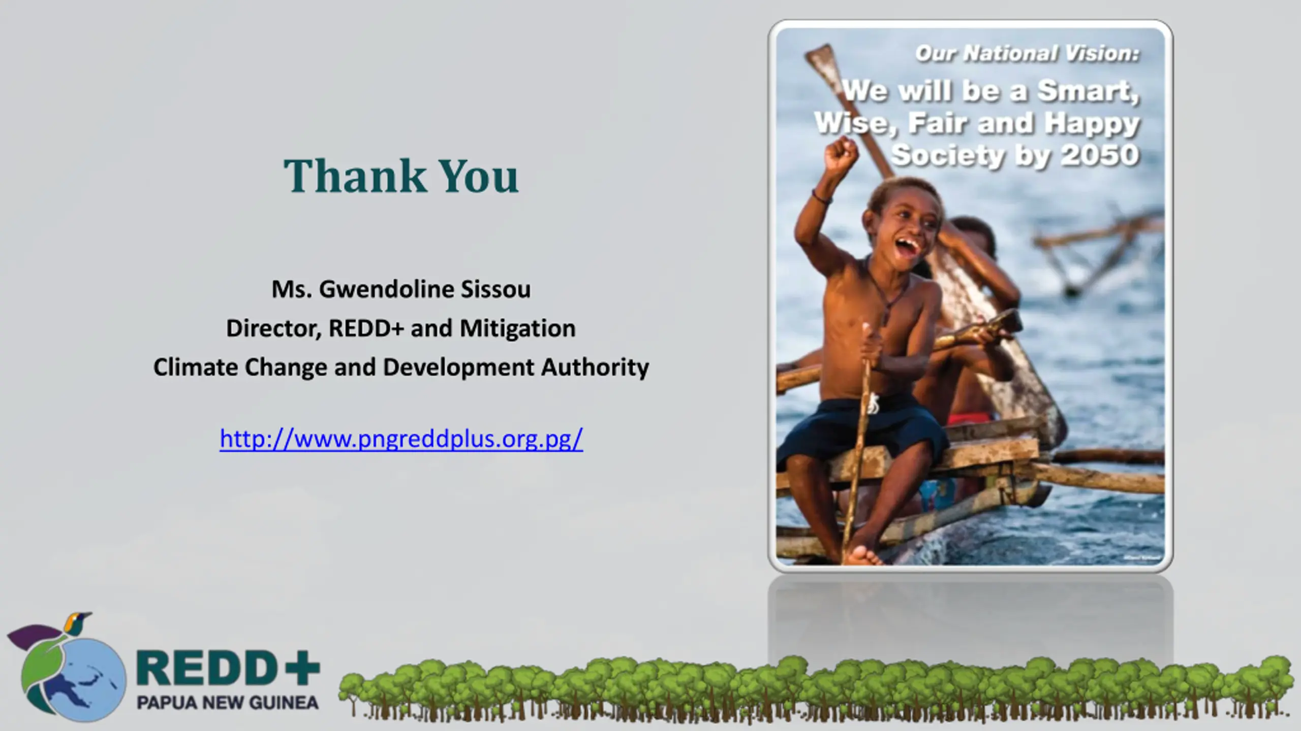 Thank You Ms. Gwendoline Sissou Director, REDD+ and Mitigation Climate Change and Development Authority http://www.pngreddplus.org.pg/
