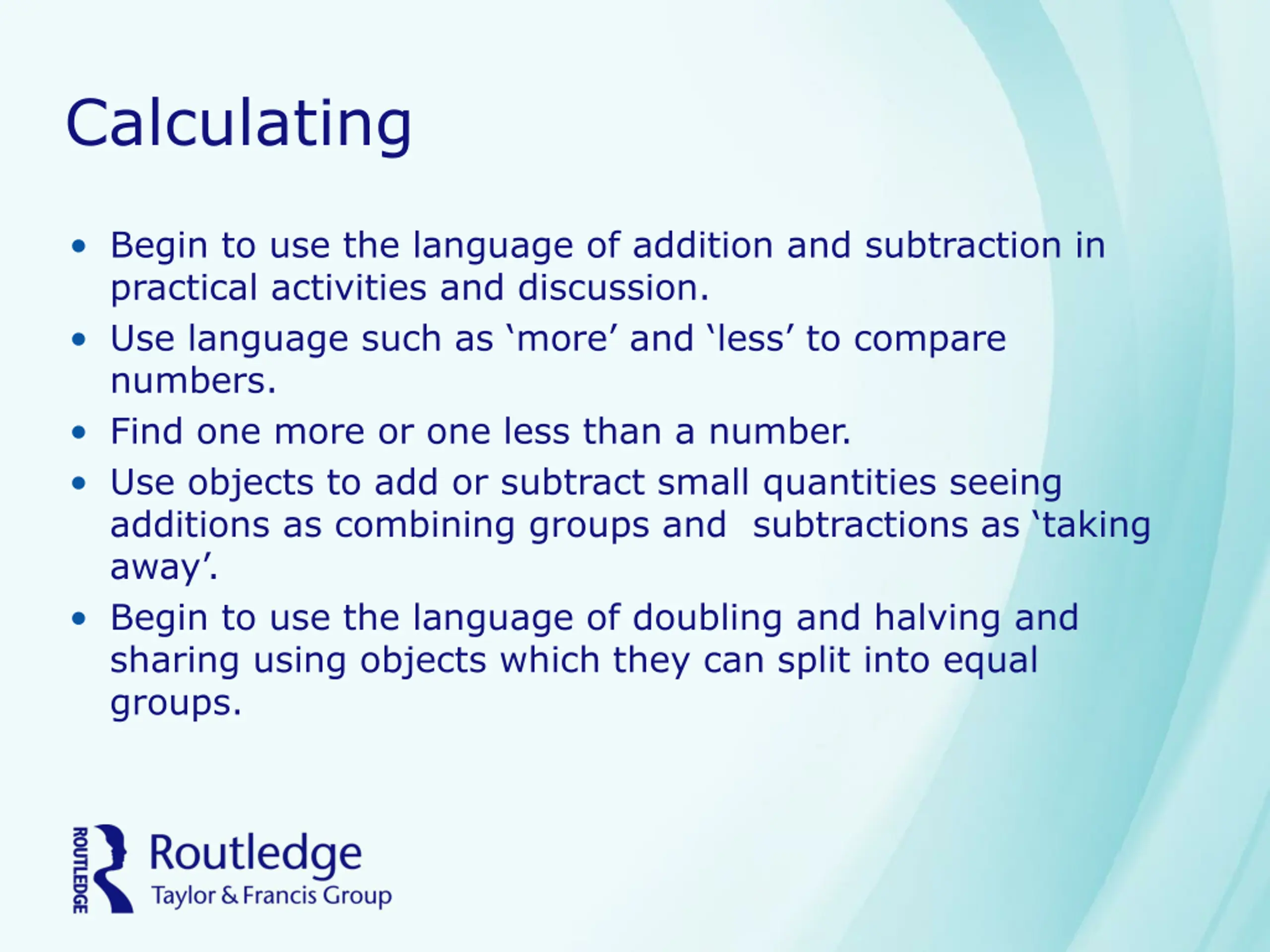 Calculating Begin to use the language of addition and subtraction in practical activities and discussion. Use language such as more and less to compare numbers. Find one more or one less than a number. Use objects to add or subtract small quantities seeing additions as combining groups and subtractions as taking away . Begin to use the language of doubling and halving and sharing using objects which they can split into equal groups.