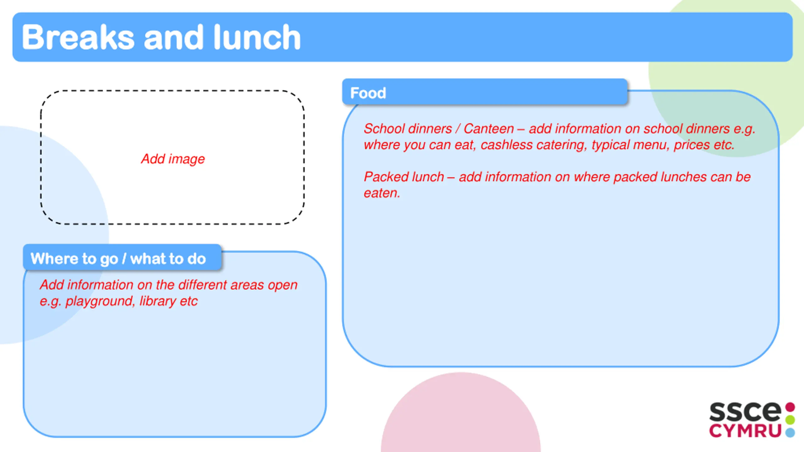Breaks and lunch Breaks and lunch Food Food School dinners / Canteen add information on school dinners e.g. where you can eat, cashless catering, typical menu, prices etc. Add image Packed lunch add information on where packed lunches can be eaten. Where to go / what to do Where to go / what to do Add information on the different areas open e.g. playground, library etc