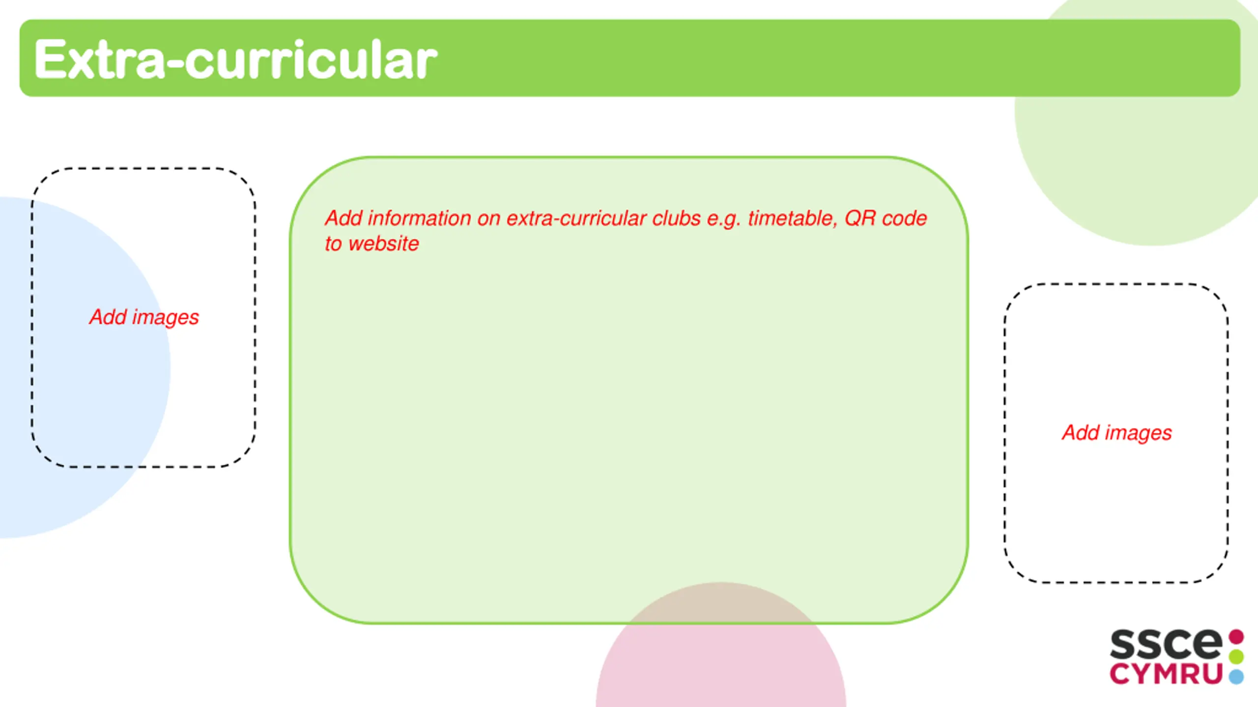 Extra Extra- -curricular curricular Add information on extra-curricular clubs e.g. timetable, QR code to website Add images Add images