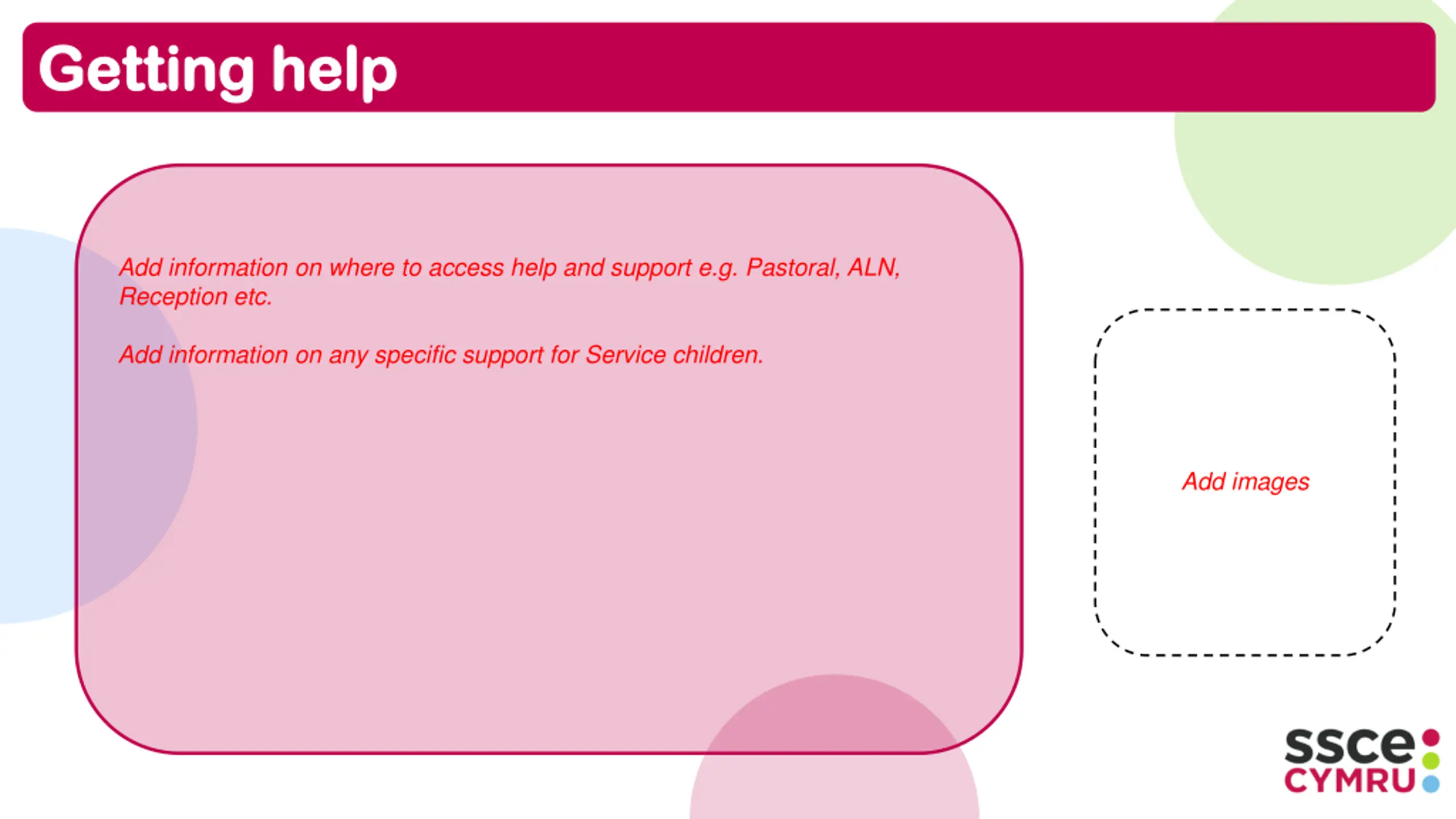 Getting help Getting help Add information on where to access help and support e.g. Pastoral, ALN, Reception etc. Add information on any specific support for Service children. Add images