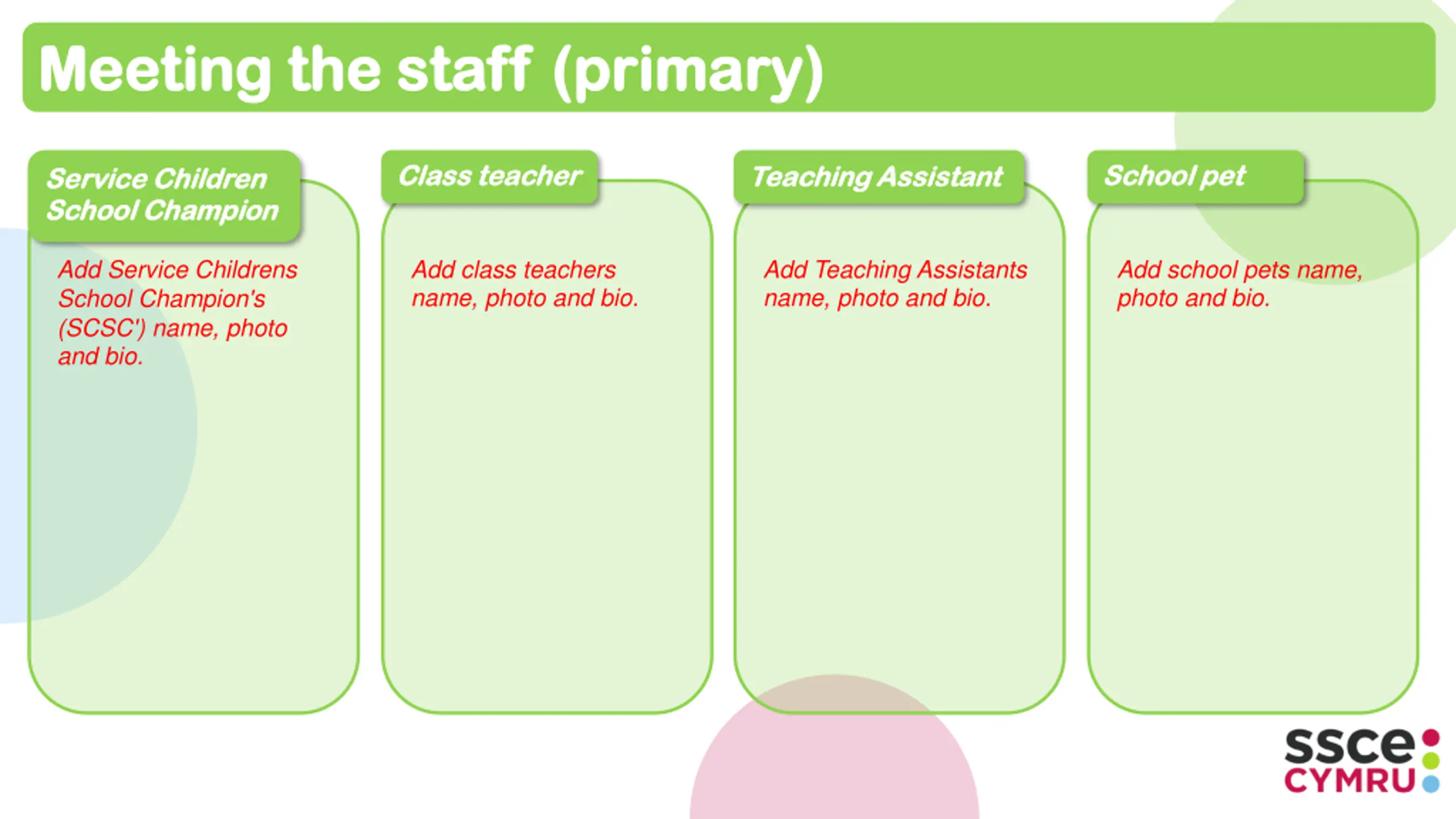 Meeting the staff (primary) Meeting the staff (primary) Class teacher Class teacher School pet School pet Teaching Assistant Teaching Assistant Service Children Service Children School Champion School Champion Add Service Childrens School Champion's (SCSC') name, photo and bio. Add class teachers name, photo and bio. Add Teaching Assistants name, photo and bio. Add school pets name, photo and bio.