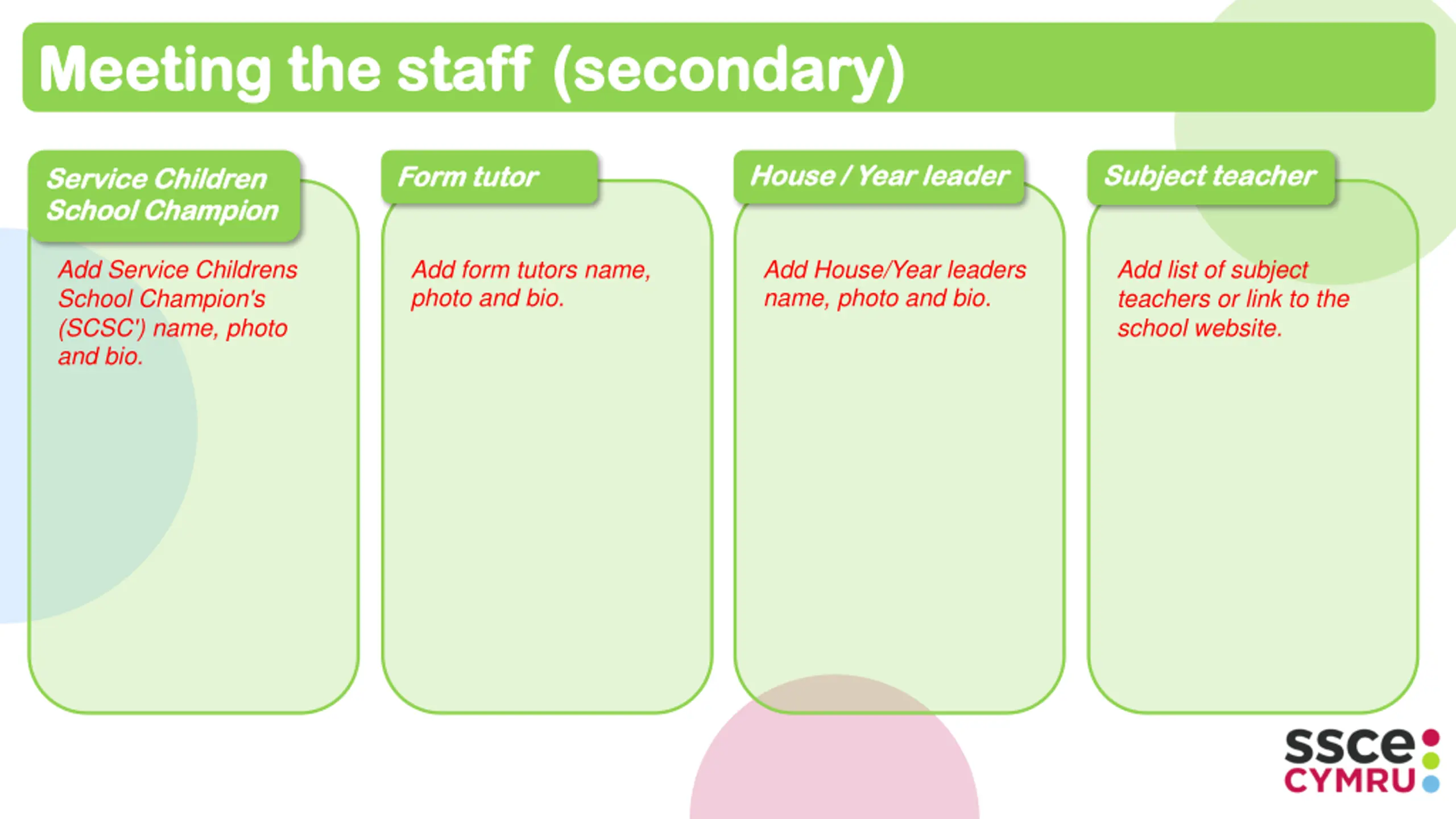 Meeting the staff (secondary) Meeting the staff (secondary) House / Year leader House / Year leader Subject teacher Subject teacher Form tutor Form tutor Service Children Service Children School Champion School Champion Add Service Childrens School Champion's (SCSC') name, photo and bio. Add form tutors name, photo and bio. Add House/Year leaders name, photo and bio. Add list of subject teachers or link to the school website.