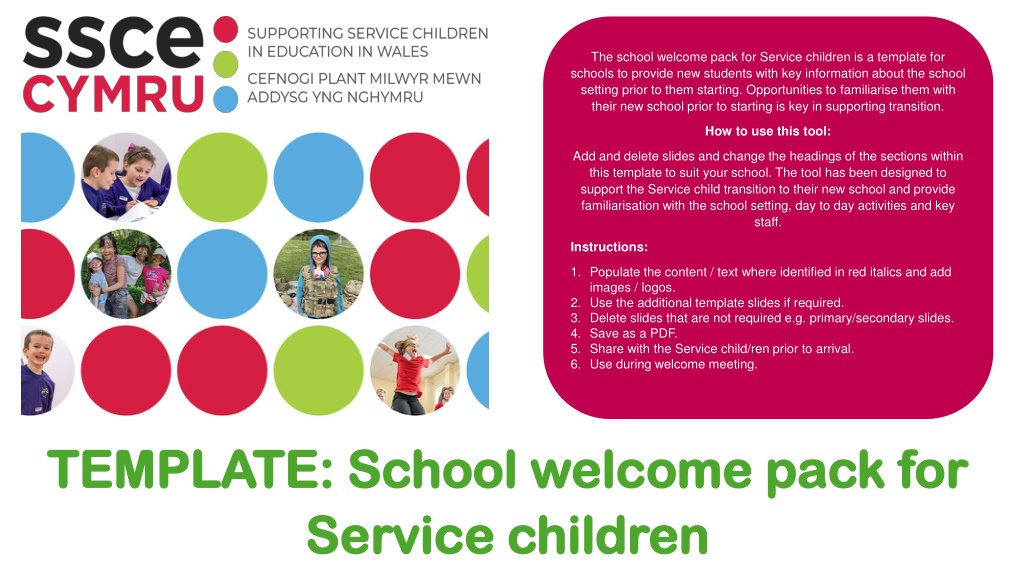The school welcome pack for Service children is a template for schools to provide new students with key information about the school setting prior to them starting. Opportunities to familiarise them with their new school prior to starting is key in supporting transition. How to use this tool: Add and delete slides and change the headings of the sections within this template to suit your school. The tool has been designed to support the Service child transition to their new school and provide familiarisation with the school setting, day to day activities and key staff. Instructions: 1. Populate the content / text where identified in red italics and add images / logos. 2. Use the additional template slides if required. 3. Delete slides that are not required e.g. primary/secondary slides. 4. Save as a PDF. 5. Share with the Service child/ren prior to arrival. 6. Use during welcome meeting. TEMPLATE: School welcome pack for TEMPLATE: School welcome pack for Service children Service children
